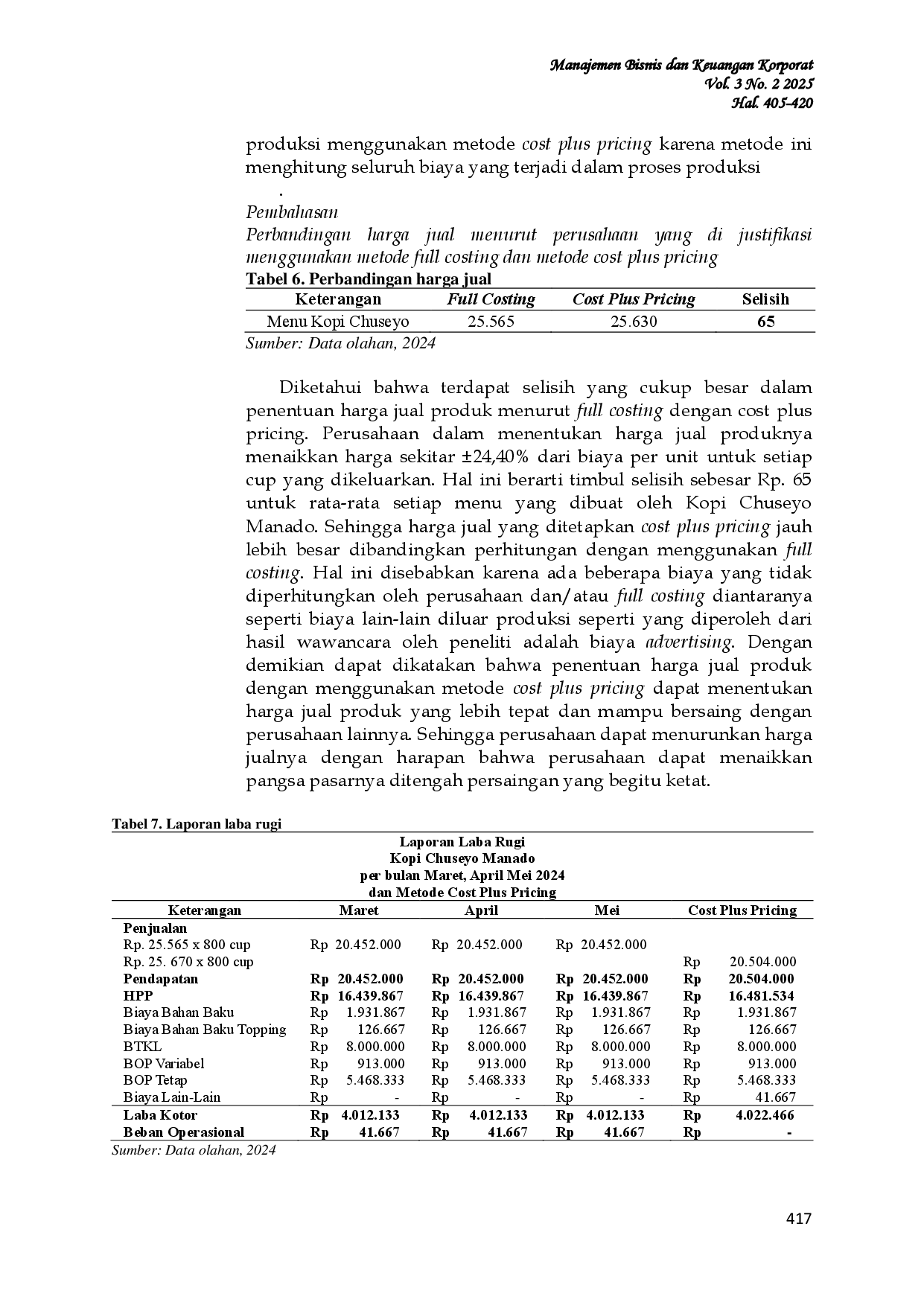 Manajemen Bisnis dan Keuangan KorporatManajemen Bisnis dan Keuangan KorporatPenelitian ini bertujuan untuk menganalisis penerapan metode cost plus pricing dengan pendekatan full costing dalam menentukan harga jual di Kopi Chuseyo Manado. Latar belakang penelitian ini didasarkan pada kebijakan waralaba di mana harga jual ditentukan secara terpusat, tanpa mempertimbangkan biaya produksi dan non-produksi cabang lokal. Penelitian ini menggunakan metode kualitatif deskriptif dengan pendekatan studi kasus. Data dikumpulkan melalui wawancara dan dokumentasi, serta biaya barang yang diproduksi dianalisis menggunakan metode full costing dan penentuan harga jual dengan menambahkan margin keuntungan. Hasil penelitian menunjukkan adanya perbedaan antara harga jual yang ditentukan secara terpusat dan harga yang dihitung menggunakan metode cost plus pricing. Metode ini dianggap lebih akurat karena mencakup semua biaya yang relevan, membantu bisnis mencapai keuntungan optimal dan menghindari kerugian akibat penetapan harga yang tidak akurat. Penelitian ini merekomendasikan metode ini untuk UMKM serupa untuk meningkatkan akurasi penetapan harga.