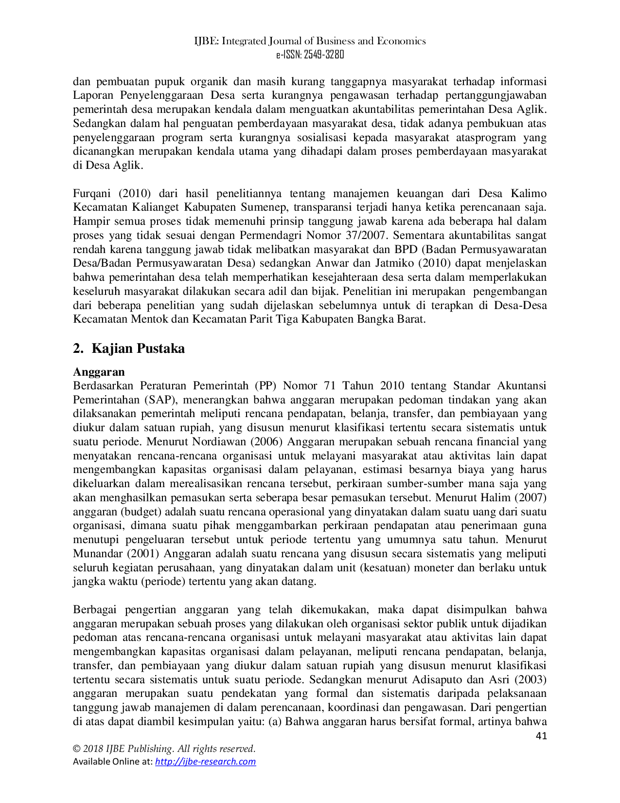 Integrated Journal of Business and EconomicsIntegrated Journal of Business and EconomicsPenelitian empiris ini bertujuan untuk menelaah kontribusi dan peran manajemen keuangan desa oleh aparatur desa, meliputi seluruh aktivitas seperti perencanaan, pelaksanaan, penatausahaan, pelaporan, dan akuntabilitas keuangan desa serta dana desa yang bersumber dari Anggaran Pendapatan dan Belanja Negara yang ditransfer melalui Anggaran Pendapatan dan Belanja Daerah Kabupaten/Kota, dan digunakan untuk membiayai administrasi, pembangunan, pemberdayaan masyarakat sesuai dengan Peraturan Menteri Dalam Negeri No. 113 Tahun 2014. Hasil penelitian diharapkan dapat memberikan kontribusi bagi desa di Kabupaten Bangka Barat dalam merumuskan strategi pembuatan laporan keuangan, pengelolaan anggaran yang baik, penyelenggaraan pelatihan teknologi informasi bagi aparatur desa, serta pelatihan dokumentasi dan administrasi yang tertib termasuk pembuatan kode dan arsip. Populasi penelitian mencakup seluruh desa di Kecamatan Mentok dan Parit Tiga, Kabupaten Bangka Barat, sedangkan sampel terdiri dari desa‑desa yang terletak secara geografis di kedua kecamatan tersebut. Penelitian ini menggunakan data primer berupa wawancara dan data sekunder yang diambil langsung dari objek penelitian, dianalisis dengan uji statistik deskriptif dan kuantitatif serta analisis korelasi Pearson antara variabel‑variabel penelitian.