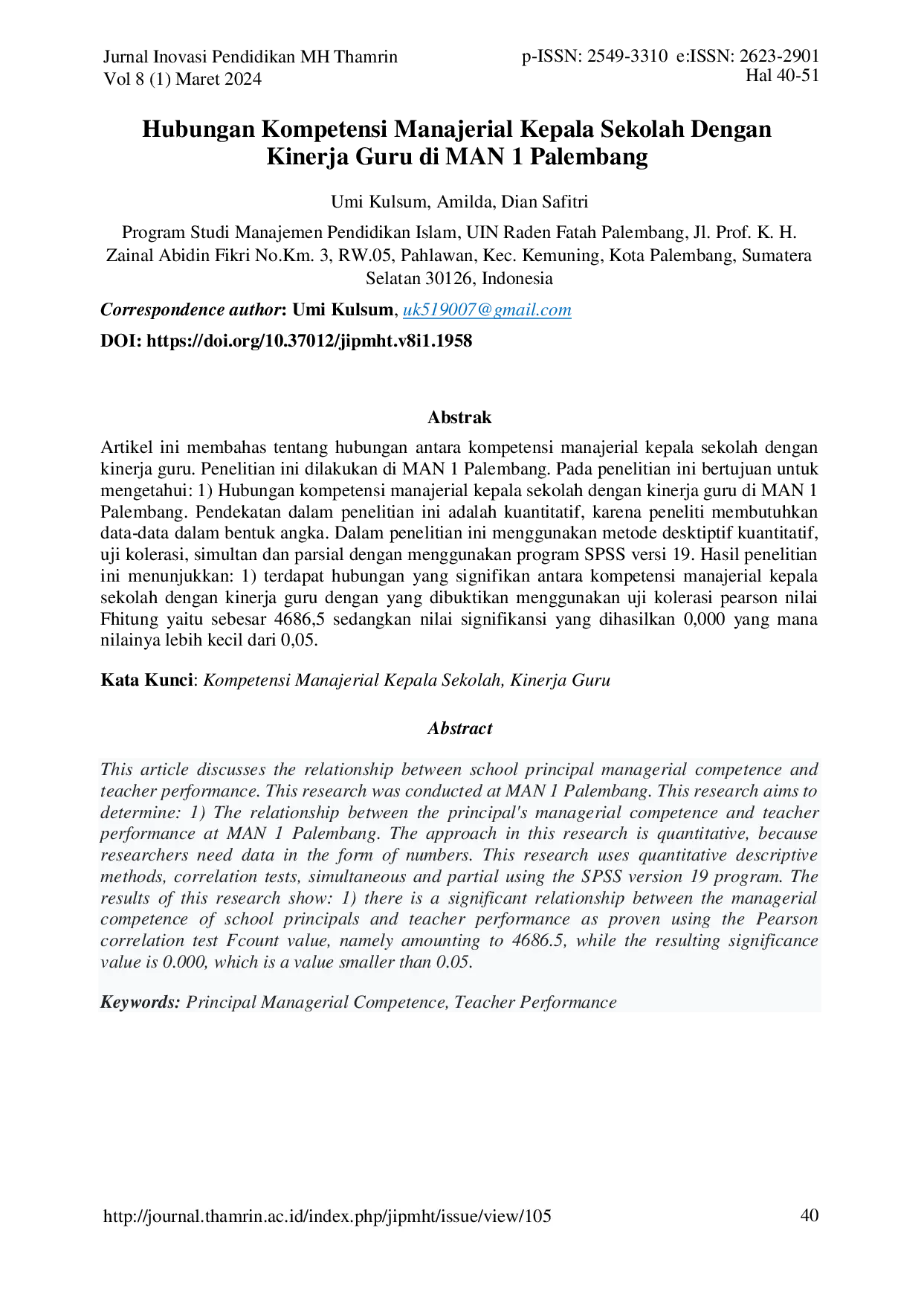 Jurnal Inovasi Pendidikan MH ThamrinJurnal Inovasi Pendidikan MH ThamrinArtikel ini membahas tentang hubungan antara kompetensi manajerial kepala sekolah dengan kinerja guru. Penelitian ini dilakukan di MAN 1 Palembang. Pada penelitian ini bertujuan untuk mengetahui: 1) . Pendekatan dalam penelitian ini adalah kuantitatif, karena peneliti membutuhkan data-data dalam bentuk angka. Dalam penelitian ini menggunakan metode desktiptif kuantitatif, uji kolerasi, simultan dan parsial dengan menggunakan program SPSS versi 19. Hasil penelitian ini menunjukkan: 1) terdapat hubungan yang signifikan antara kompetensi manajerial kepala sekolah dengan kinerja guru dengan yang dibuktikan menggunakan uji kolerasi pearson nilai Fhitung yaitu sebesar 4686,5 sedangkan nilai signifikansi yang dihasilkan 0,000 yang mana nilainya lebih kecil dari 0,05.