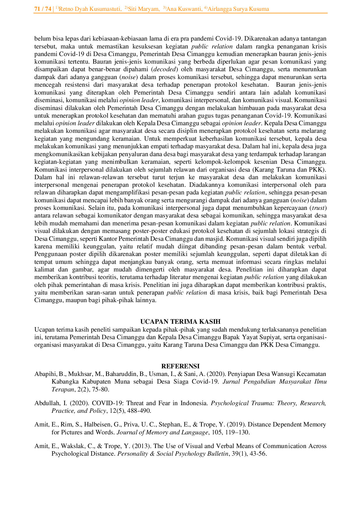 Pemerintah Desa Cimanggu menerapkan bauran komunikasi dalam kegiatan public relation untuk menanggulangi pandemi Covid-19, meliputi komunikasi diseminasi, melalui opinion leader, interpersonal, dan visual.Pendekatan ini efektif dalam mengurangi resistensi masyarakat terhadap protokol kesehatan karena mampu menjangkau masyarakat secara luas dan membangun kepercayaan.Keberhasilan ini ditunjang oleh peran aktif kepala desa, relawan desa, serta dukungan visual yang mudah dipahami.