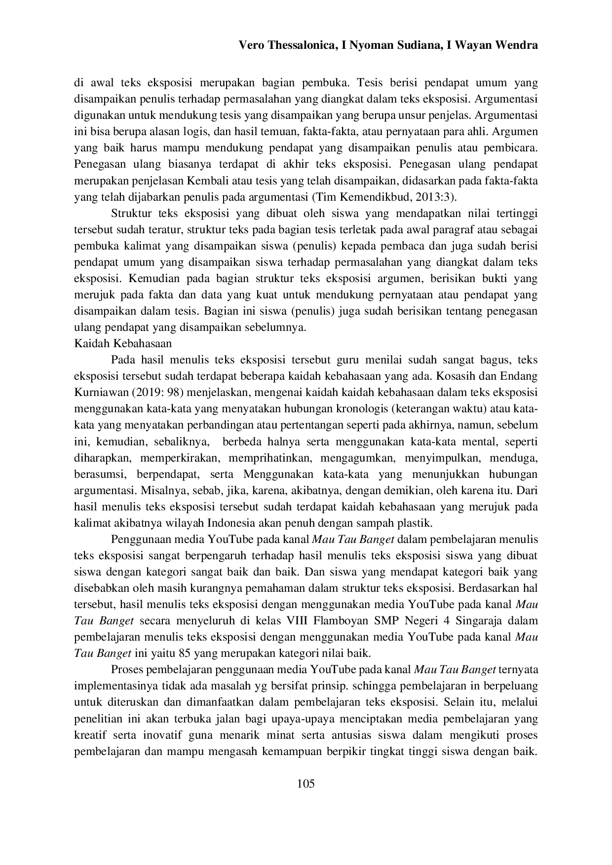 Pertama, perlu diteliti bagaimana penggunaan kanal YouTube selain Mau Tau Banget memengaruhi keterampilan menulis teks eksposisi siswa, untuk mengetahui apakah efektivitas pembelajaran bergantung pada konten tertentu atau dapat diterapkan secara luas. Kedua, penting untuk mengembangkan penelitian tentang strategi bimbingan terstruktur bagi siswa dengan kemampuan rendah dalam kosakata baku selama pembelajaran berbasis media video, agar ketidaksetaraan kemampuan dapat diminimalkan. Ketiga, perlu dievaluasi model pembelajaran hibrida yang menggabungkan tayangan YouTube di kelas dan tugas mandiri di rumah, untuk melihat bagaimana akses media di luar sekolah memengaruhi hasil belajar siswa yang tidak memiliki perangkat pribadi, sehingga pembelajaran menjadi lebih inklusif dan berkelanjutan.