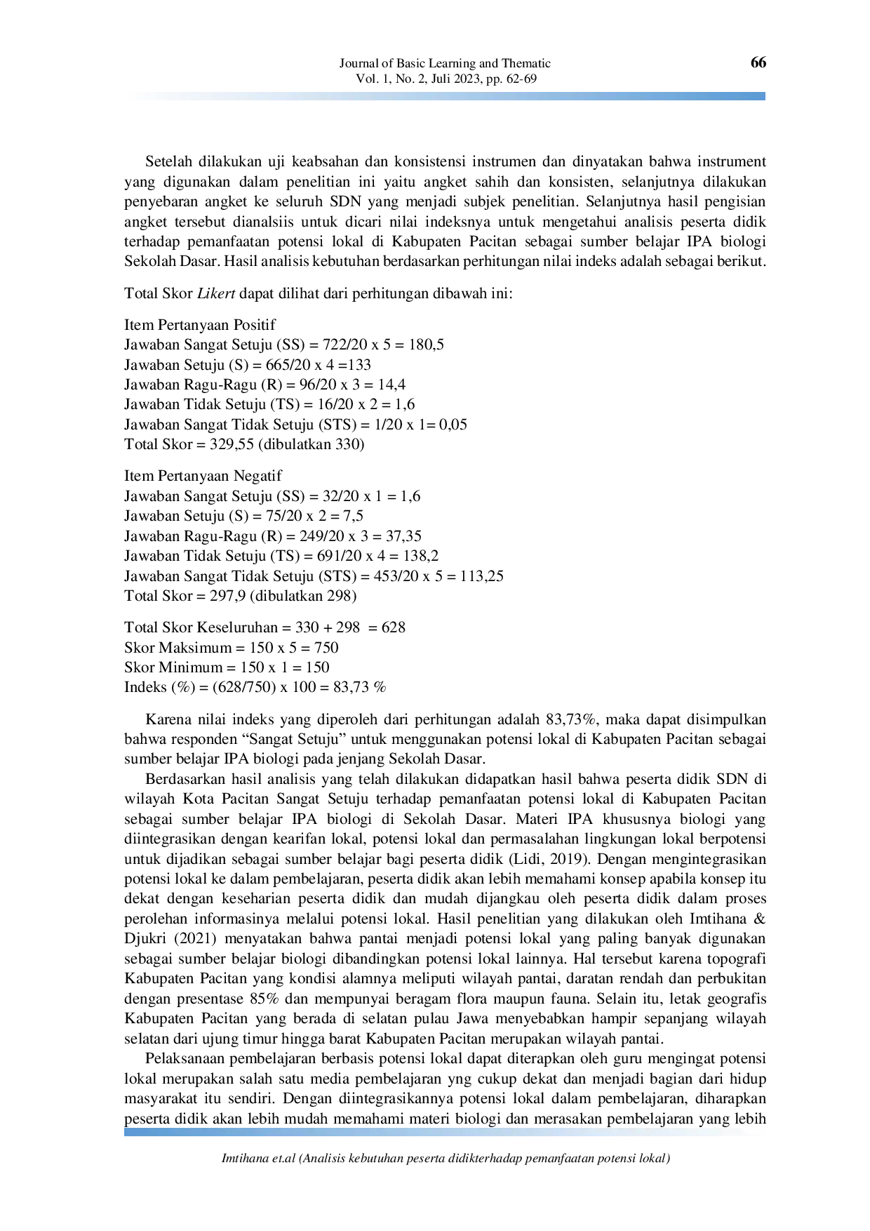 Berdasarkan hasil penelitian, potensi lokal layak dan perlu untuk dimanfaatkan sebagai sumber belajar IPA biologi karena dapat membuat pembelajaran lebih kontekstual dan menarik.Peserta didik Sangat Setuju memanfaatkan potensi lokal Pacitan sebagai sumber belajar biologi Sekolah Dasar.Pemanfaatan potensi lokal meningkatkan sikap peduli lingkungan, membentuk karakter peserta didik, dan membantu mengenali potensi daerah.