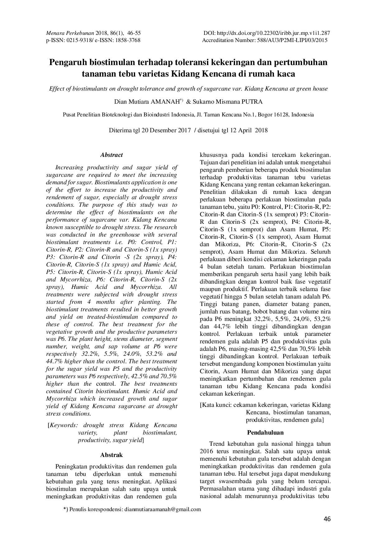 Menara PerkebunanMenara PerkebunanPeningkatan produktivitas dan rendemen gula tebu diperlukan untuk memenuhi kebutuhan gula yang terus meningkat. Aplikasi biostimulan merupakan salah satu upaya untuk meningkatkan produktivitas dan rendemen gula, khususnya pada kondisi tercekam kekeringan. Tujuan dari penelitian ini adalah untuk mengetahui pengaruh pemberian beberapa produk biostimulan terhadap produktivitas tebu varietas Kidang Kencana yang rentan cekaman kekeringan. Penelitian dilakukan di rumah kaca dengan perlakuan beberapa perlakuan biostimulan pada tanaman tebu, yaitu P0: Kontrol, P1: Citorin-R, P2: Citorin-R dan Citorin-S (1x semprot) P3: Citorin-R dan Citorin-S (2x semprot), P4: Citorin-R, Citorin-S (1x semprot) dan Asam Humat, P5: Citorin-R, Citorin-S (1x semprot), Asam Humat dan Mikoriza, P6: Citorin-R, Citorin-S (2x semprot), Asam Humat dan Mikoriza. Seluruh perlakuan diberi kondisi cekaman kekeringan pada 4 bulan setelah tanam. Perlakuan biostimulan memberikan pengaruh serta hasil yang lebih baik dibandingkan dengan kontrol baik fase vegetatif maupun produktif. Perlakuan terbaik selama fase vegetatif hingga 5 bulan setelah tanam adalah P6. Tinggi batang panen, diameter batang panen, jumlah ruas batang, bobot batang dan volume nira pada P6 meningkat 32,2%, 5,5%, 24,0%, 53,2% dan 44,7% lebih tinggi dibandingkan dengan kontrol. Perlakuan terbaik untuk parameter rendemen gula adalah P5 dan produktivitas gula adalah P6, masing-masing 42,5% dan 70,5% lebih tinggi dibandingkan kontrol. Perlakuan terbaik tersebut mengandung komponen biostimulan yaitu Citorin, Asam Humat dan Mikoriza yang dapat meningkatkan pertumbuhan dan rendemen gula tanaman tebu Kidang Kencana pada kondisi cekaman kekeringan.