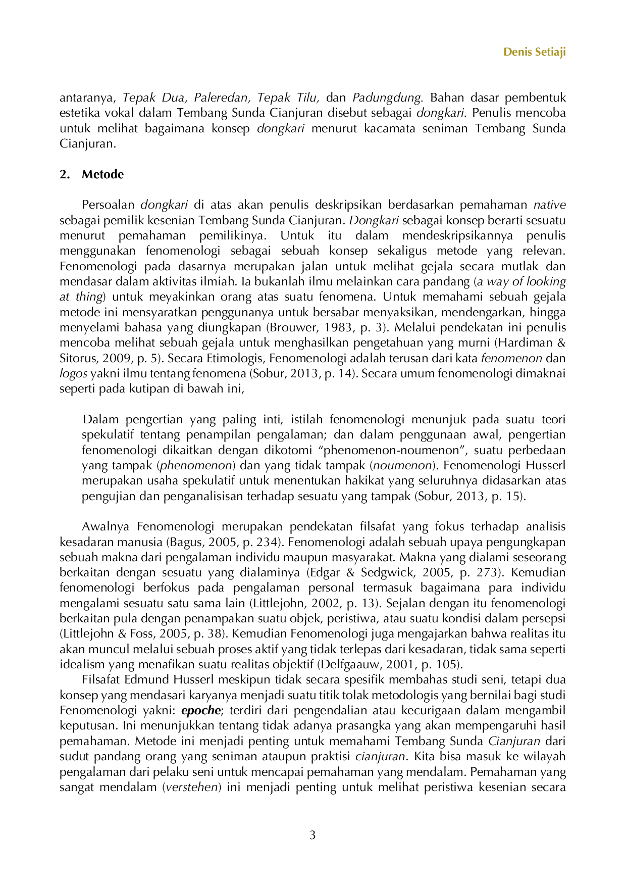 Jurnal Mebang: Kajian Budaya Musik dan Pendidikan MusikJurnal Mebang: Kajian Budaya Musik dan Pendidikan MusikPenelitian ini difokuskan untuk melihat bagaimana pemahaman konsep dongkari dalam perspektif seniman Tembang Sunda Cianjuran. Penelitian yang dilakukan menggunakan metode fenomenologi dengan melakukan studi lapangan ke sejumlah praktisi Tembang Sunda Cianjuran di wilayah Bandung, Jawa Barat. Penulis mencoba melakukan pemaparan pengetahuan dan pemaknaan praktisi terhadap dongkari dalam konteks kehidupan masyarakat Tembang Sunda Cianjuran. Pada akhirnya dongkari dipahami sebagai konsep yang cukup kompleks, memuat konteks kehidupan masyarakat Sunda, sebagai material konstruksi estetik vokal, sebagai pembentuk gaya personal, hingga sebagai indikator virtuositas para praktisi Tembang Sunda.