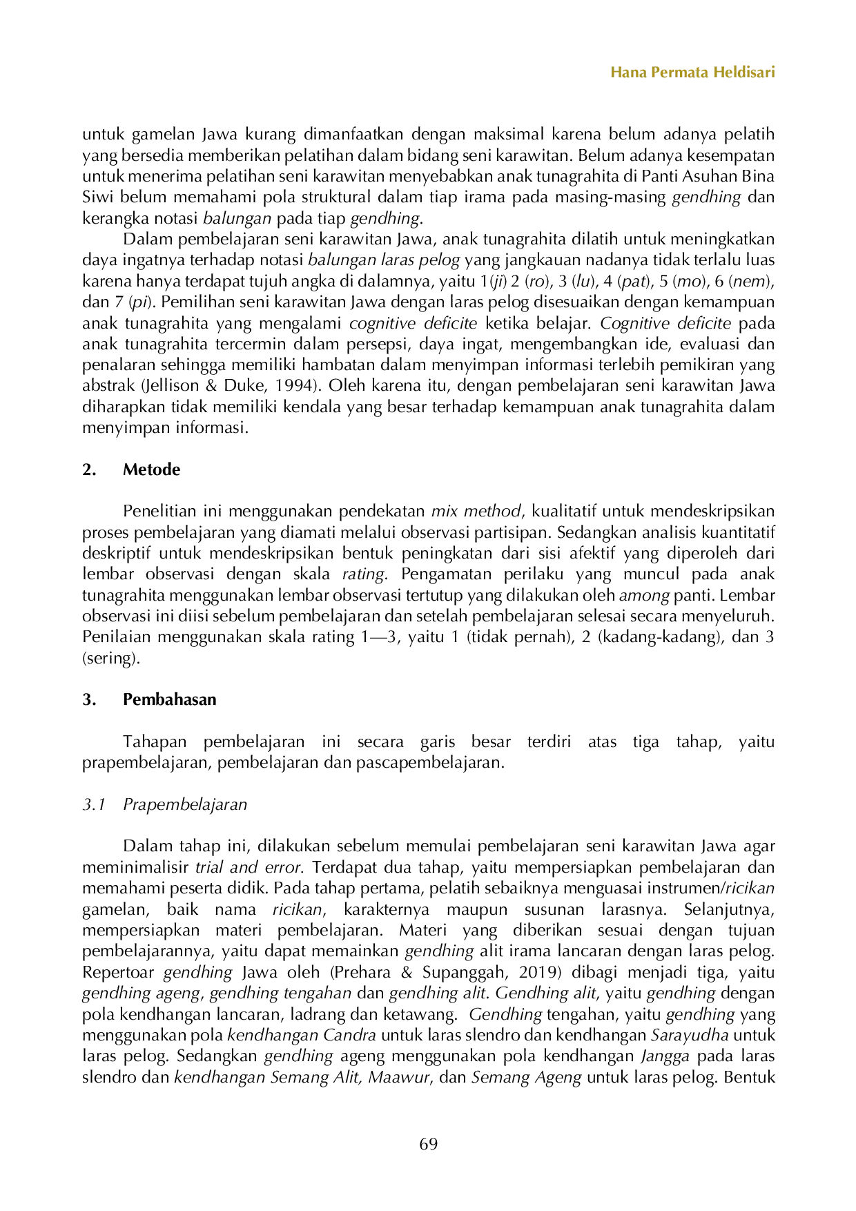 Tunagrahita ringan atau mampu didik dapat menerima pembelajaran karawitan Jawa bentuk lancaran dengan baik, tergantung bagaimana pelatih mencari pendekatan yang tepat Jawa dengan model pembelajaran personal dapat meningkatkan keterampilan bermain gamelan Jawa dan memberi dampak terhadap perilaku positif anak tunagrahita, yaitu percaya diri, lebih mudah beradaptasi, dan bekerja sama.Pada penelitian selanjutnya, penelitian dapat dilanjutkan terhadap subjek penelitian dengan kriteria anak berkebutuhan khusus lainnya menggunakan materi dari jenis gendhing dan laras yang berbeda.