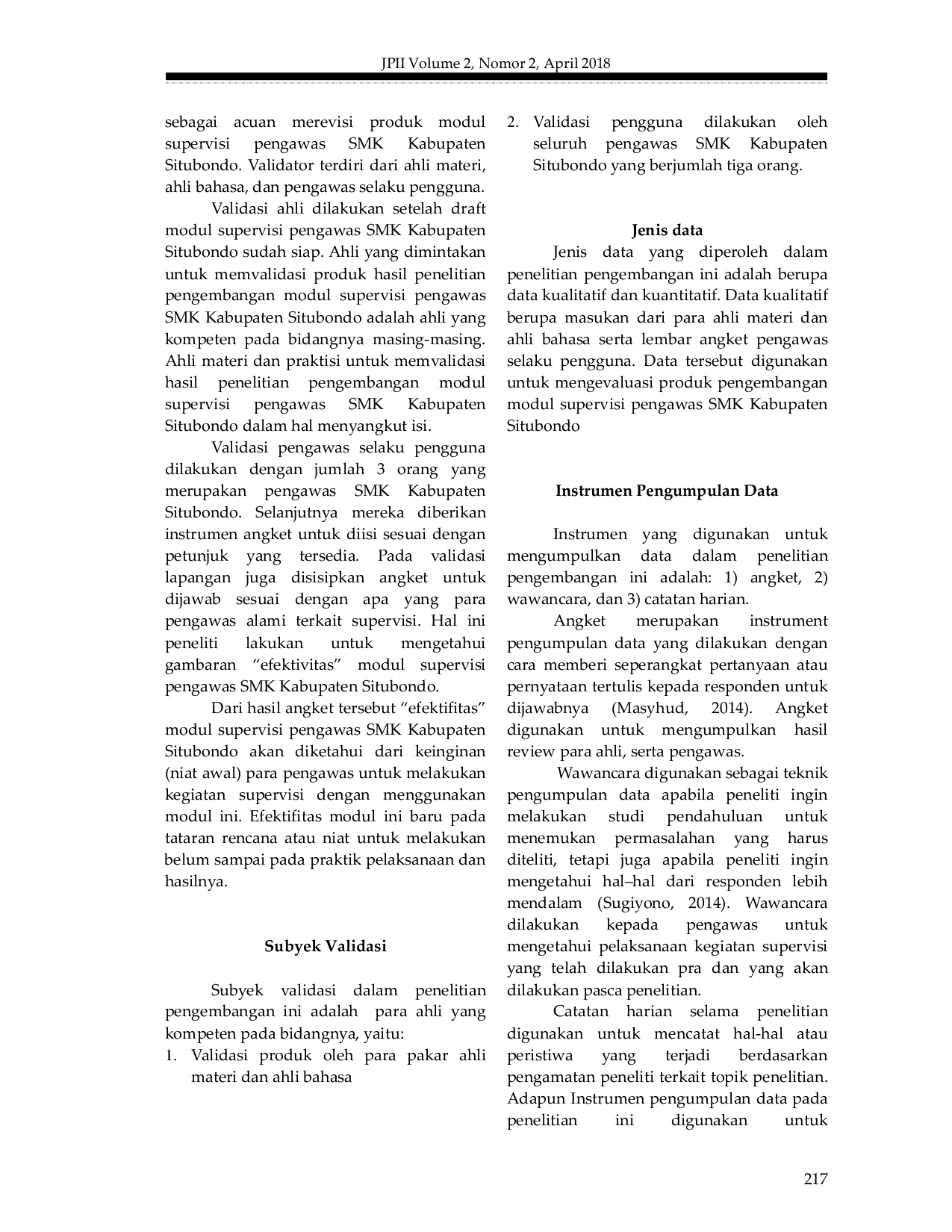 Jurnal Pendidikan Islam IndonesiaJurnal Pendidikan Islam IndonesiaPenelitian ini bertujuan untuk mengembangkan modul supervisi bagi pengawas SMK di Kabupaten Situbondo. Penelitian ini menggunakan metode penelitian dan pengembangan (Research and Development) dan berlangsung di Kabupaten Situbondo. Hasil penelitian ini adalah modul supervisi yang valid dan layak digunakan oleh pengawas SMK di Kabupaten Situbondo.