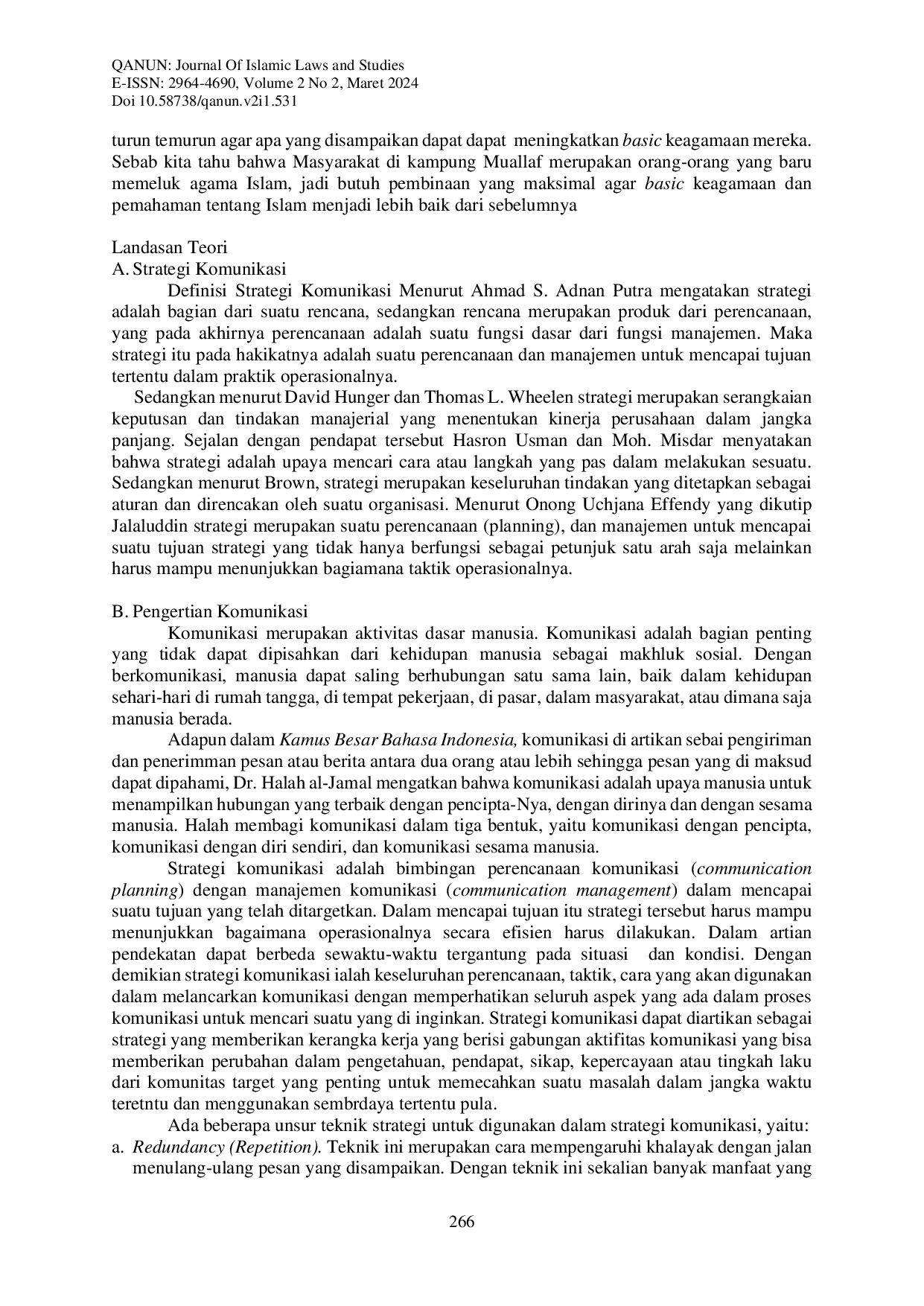 QANUN: Journal of Islamic Laws and StudiesQANUN: Journal of Islamic Laws and StudiesStrategi Komunikasi Dakwah dalam Pembinaan Basic Agama Islam di Kampung Muallaf Desa Garaupa Kecamatan Pasilambena Kabupaten Selayar, penelitian ini bertujuan untuk mengetahui bagaimana strategi komunikasi dakwah dalam Pembinaan basic Agama Islam di Masyarakat Kampung Muallaf Desa Garaupa Kecamatan Pasilambena Kabupaten Selayar dan faktor apa saja yang mendukung dan menghambat proses dakwah dalam Pembinaan basic Agama Islam di Kampung Muallaf Desa Garaupa Kecamatan Pasilambena Kabupaten Selayar. Penelitian ini menggunakan jenis penelitian kualitatif, adapun pendekatan penelitian ini menggunakan metode analisis deskriptif, namun bertujuan untuk memberikan gambaran secara tepat tentang strategi komunikasi dakwah yang efektif Pembinaan basic Agama Islam di Kampung Muallaf Desa Garaupa Kecamatan Pasilambena Kabupaten Selayar. Adapun sumber data yang digunkan dalam penelitian ini adalah data primer dan data sekunder. Data primer dari tokoh Masyarakat dan data sekunder dari buku, artikel serta penelusuraan referensi yang ada relevansinya dengan penelitian ini. Adapun metode pengumpulan data yang digunakan yaitu observasi, wawancara dan dokumentasi. Teknik pengelolaan data serta analisis data yang digunakan dengan tiga tahap yaitu reduksi data, penyajian data, serta penarikan kesimpulan. Hasil penelitian ini menunjukkan bahwa strategi komunikasi Dakwah yang digunakan dalam pembinaan basic Agama Islam di Kampung Muallaf Desa Garaupa Kecamatan Pasilambena Kabupaten Selayar yaitu, dengan menggunakan komunikasi antar pribadi (interpersonal) dan komunikasi kelompok. Adapun untuk metode dakwah yang digunakan yaitu metode bil hikmah, mauidzal hasanah dan mujadalah, metode ini sangat penting agar dalam Pembinaan basic Agama Islam di Kampung Muallaf Desa Garaupa Kecamatan Pasilambena Kabupaten Selayar. Kemudian factor pendukungnya secara garis besar adalah adanya sarana dasn prasarana yang cukup walaupun masih jauh dari kata sempurna dan adanya juga beberapa penyuluh Agama. Sedangkan penghambatnya adalah tenaga pengajar atau penyuluh masih kurang.