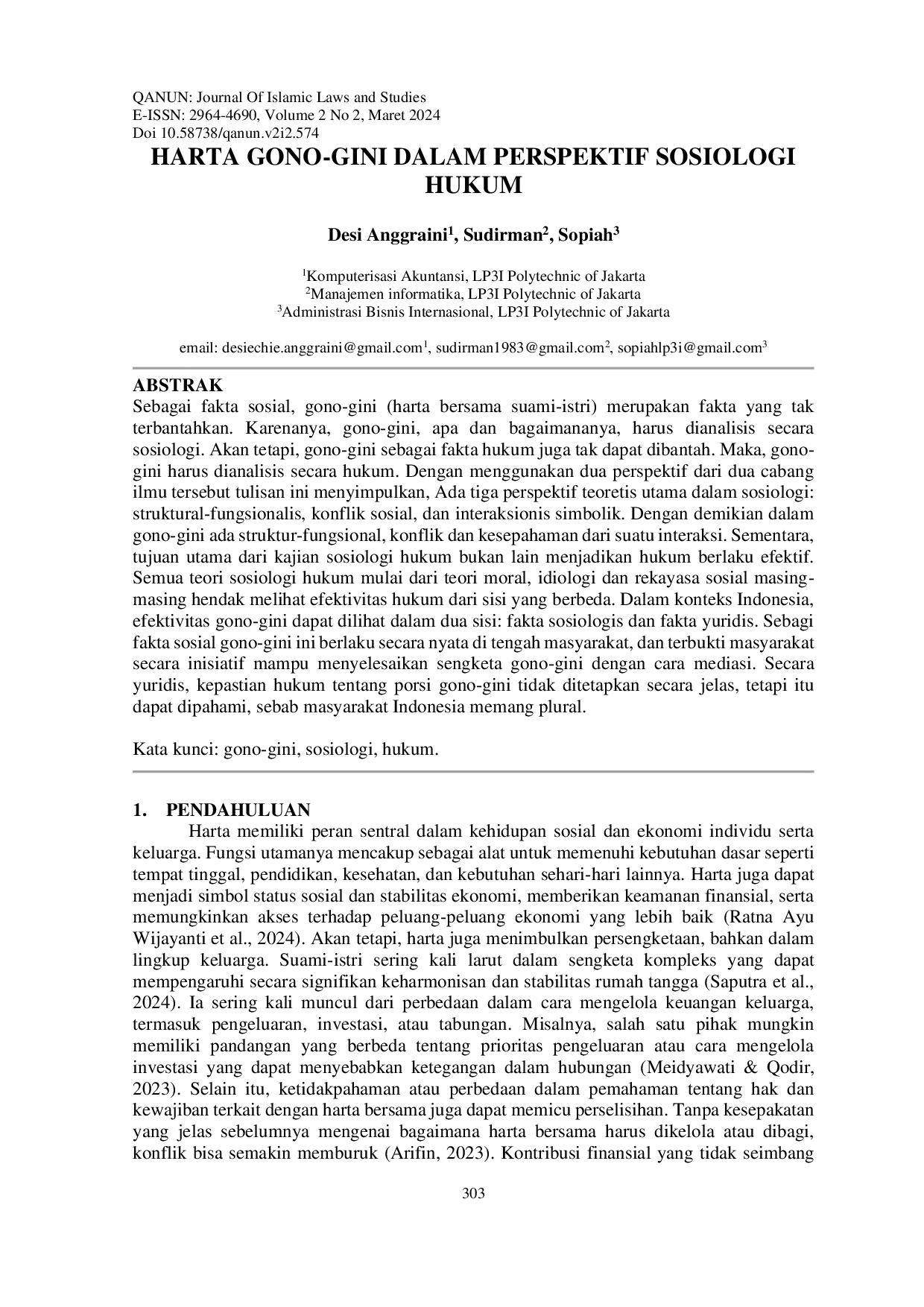 Gono-gini di Indonesia merupakan fakta sosiologis yang tak terbantahkan, dengan penerapan yang berbeda antar daerah, tetapi eksistensinya sebagai harta bersama suami-istri nyata di tengah masyarakat.Tiga perspektif sosiologi—struktural-fungsionalis, konflik sosial, dan interaksionis simbolik—diperlukan untuk memahami secara mendalam dinamika gono-gini.Dari sisi hukum, efektivitas gono-gini terlihat dari penyelesaian sengketa secara mediasi oleh masyarakat dan kepastian hukum yang fleksibel karena keragaman budaya, sehingga pemberlakuannya dianggap efektif baik secara sosial maupun yuridis.