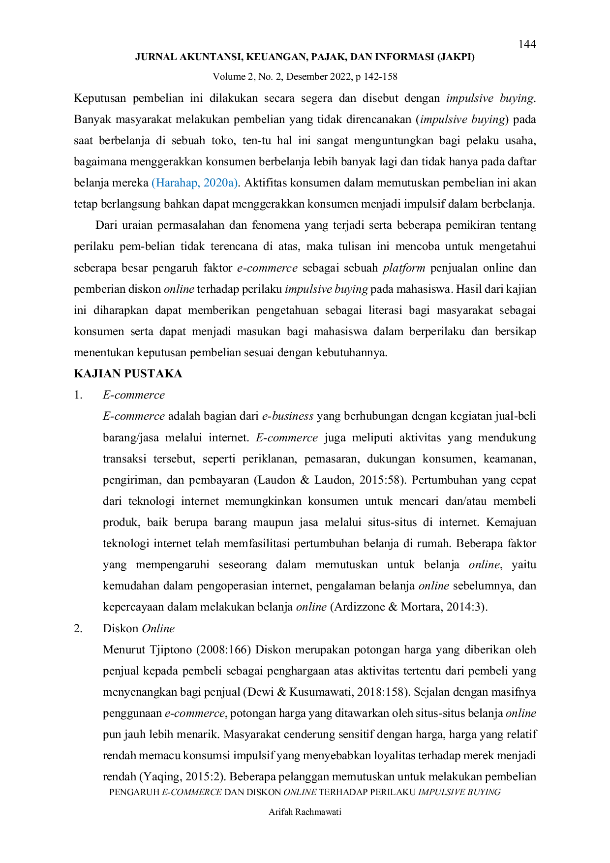 Jurnal Akuntansi, Keuangan, Pajak dan Informasi (JAKPI)Jurnal Akuntansi, Keuangan, Pajak dan Informasi (JAKPI)Penelitian ini bertujuan untuk mengetahui seberapa besar pengaruh variabel e-commerce dan diskon online terhadap perilaku impulsive buying mahasiswa, baik secara parsial maupun simultan. Hasil penelitian menunjukkan bahwa e-commerce dan diskon online secara parsial dan simultan berpengaruh signifikan terhadap perilaku impulsive buying mahasiswa.