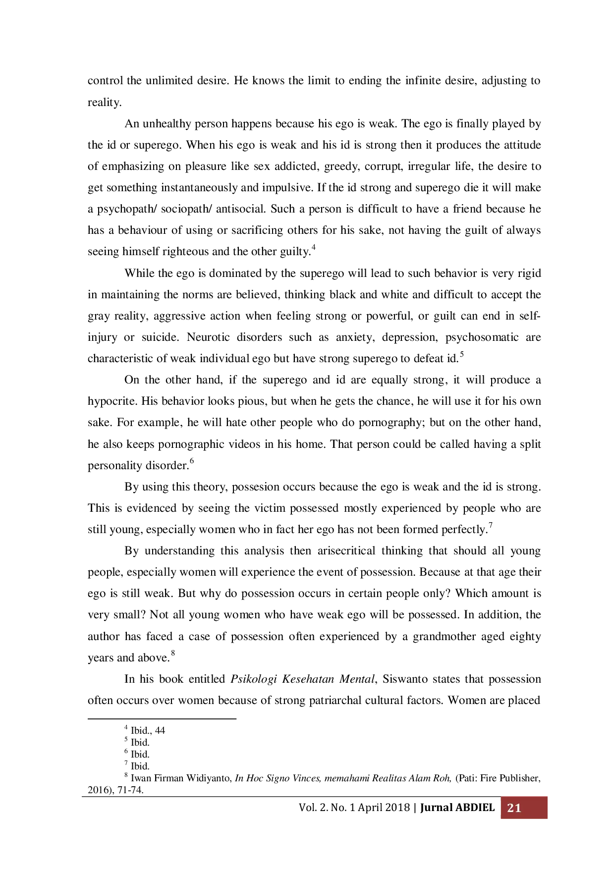 Jurnal Abdiel: Khazanah Pemikiran Teologi, Pendidikan Agama Kristen dan Musik GerejaJurnal Abdiel: Khazanah Pemikiran Teologi, Pendidikan Agama Kristen dan Musik GerejaTulisan ini mendalami persoalan mengenai apakah gangguan roh jahat. Khususnya peristiwa kerasukan merupakan hal yang sama dengan gangguan kejiwaan ataukah sesuatu hal yang berbeda. Untuk menjawab pertanyaan itu maka penulis mencoba menguraikan terlebih dahulu perspektif psikologis dalam memandang kerasukan. Selanjutnya juga penulis mendalami perspektif Alkitab, tradisi gereja dan pengalaman di lapangan terkait dengan peristiwa kerasukan. Unsur-unsur tersebut didialogkan satu dengan yang lain dan menghasilkan sebuah kesimpulan bahwa gangguan roh jahat khususnya kerasukan roh jahat adalah sesuatu yang berbeda dengan ganguan kejiwaan meskipun mempunyai gejala yang mirip dan kadang-kadang keduanya saling berkaitan. Sehingga baik gangguan roh jahat maupun gangguan kejiwaan membutuhkan penanganan yang berbeda pula sesuai dengan kasusnya.