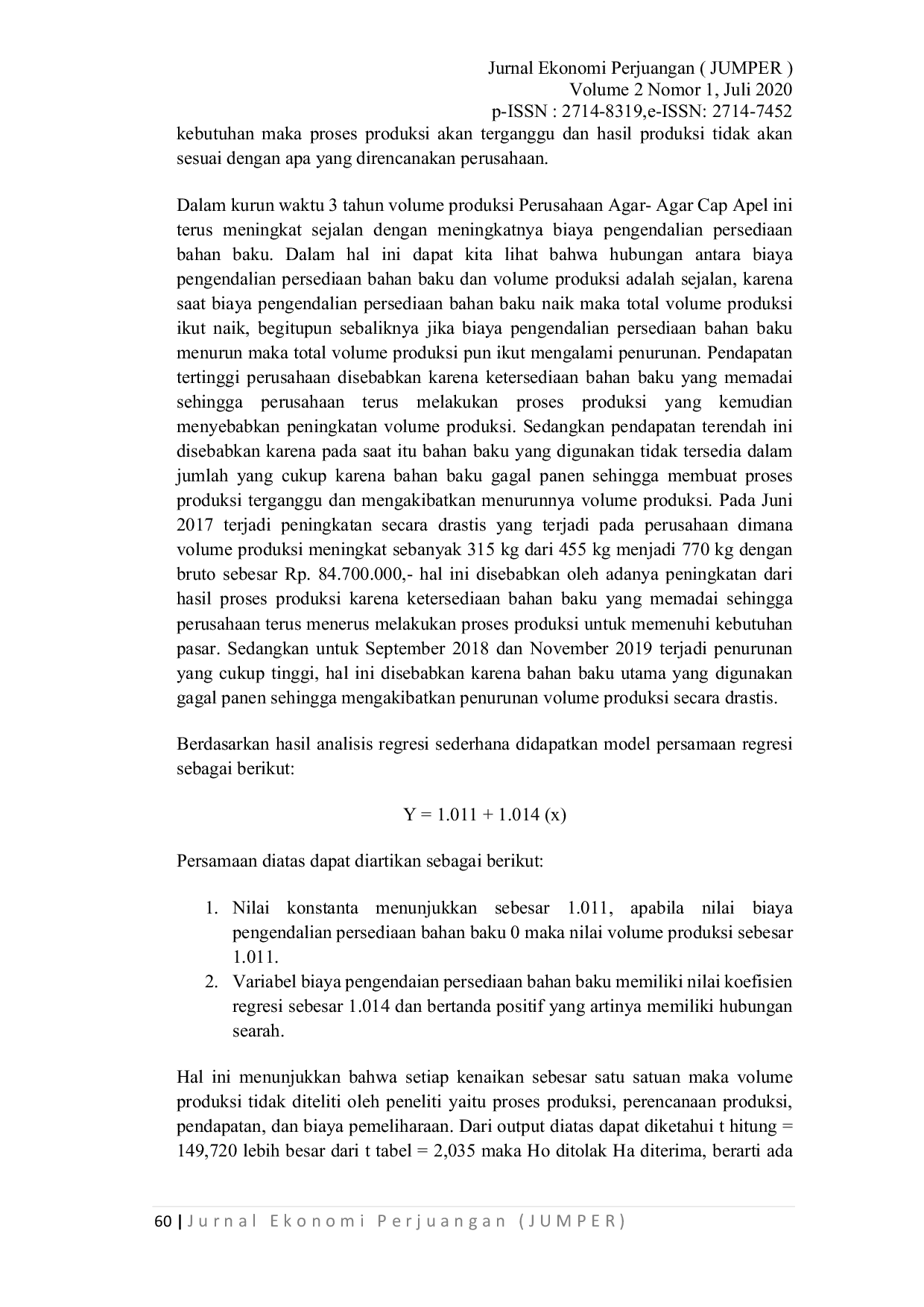JURNAL EKONOMI PERJUANGANJURNAL EKONOMI PERJUANGANTujuan penelitian ini adalah untuk mengetahui dan menganalisis hubungan variabel biaya pengendalian persediaan bahan baku dalam meningkatkan volume produksi. Metode penelitian yang digunakan adalah metode kualitatif dan data yang digunakan adalah data sekunder yang diperoleh langsung melalui wawancara dengan pemilik perusahaan. Dalam penelitian menggunakan pendekatan data berkala dengan skala bulanan yaitu 36 bulan. Apa yang diteliti oleh penulis terdiri dari satu variabel bebas dan satu variabel terikat maka alat analisis yang paling tepat adalah regresi linier sederhana. Berdasarkan hasil analisis regresi linier sederhana diketahui bahwa biaya pengendalian persediaan bahan baku memiliki pengaruh signifikan terhadap volume produksi. Hal ini juga dapat dilihat dari data perusahaan bahwa setiap kenaikan pada biaya pengendalian persediaan bahan baku maka volume produksi juga mengalami peningkatan. Hasil perhitungan menunjukkan bahwa terdapat hubungan yang sangat erat antara variabel biaya pengendalian persediaan bahan baku dalam meningkatkan volume produksi.
