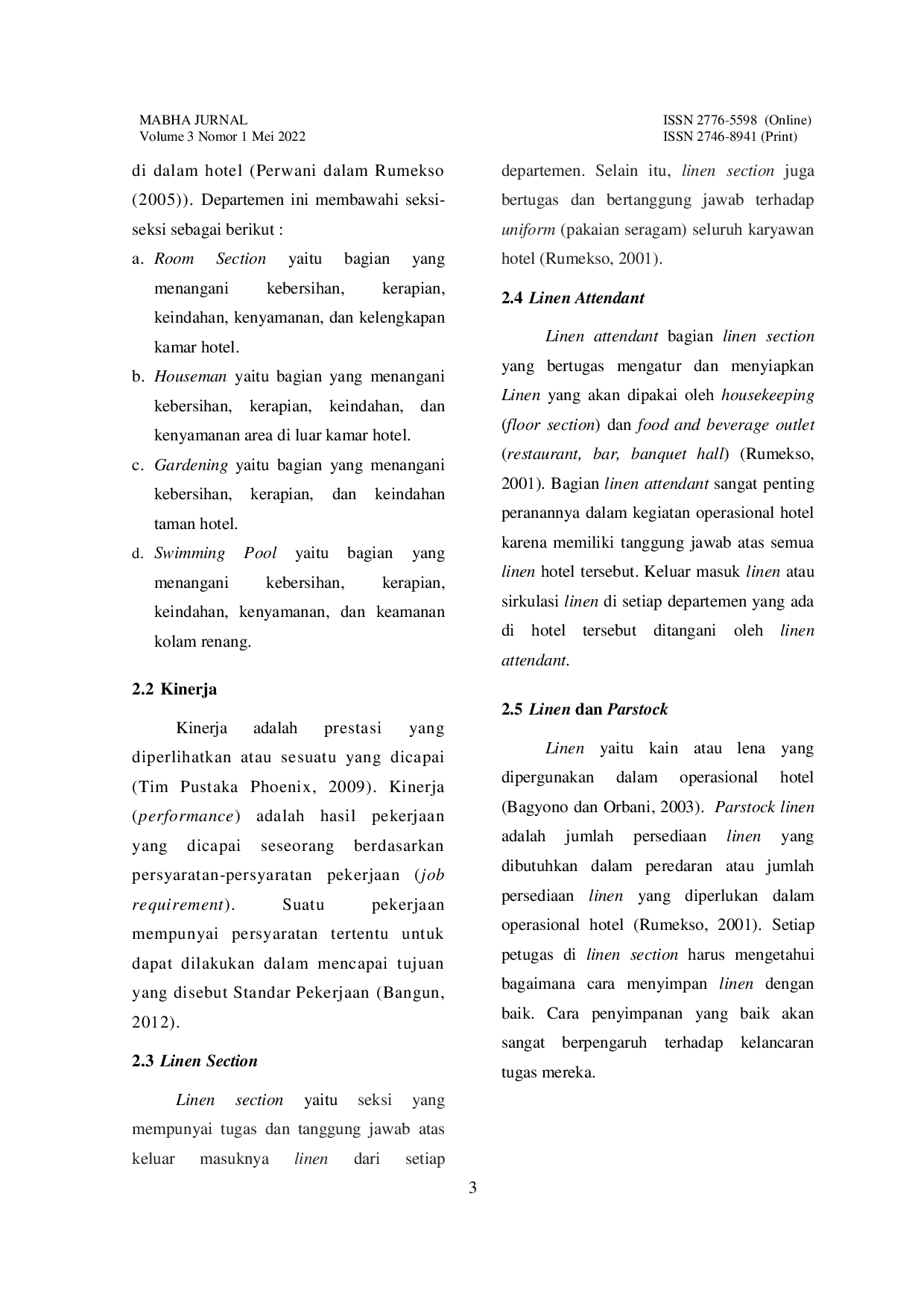 One moment, please...One moment, please...Housekeeping Department adalah linen section yaitu seksi yang mempunyai tugas dan tanggung jawab atas keluar masuknya linen dari setiap departemen. Linen section bertugas dan bertanggung jawab terhadap uniform (pakaian seragam) seluruh karyawan hotel. Penelitian ini bertujuan untuk mengetahui cara penanganan parstock linen, cara penyimpanan linen, penghitungan parstock linen yang baik dan benar serta untuk mengetahui kendala dalam penanganan parstock linen dan penyimpanan linen di Hotel Grand Orchid Solo. Petugas linen attendant di Hotel Grand Orchid Solo memiliki wilayah kerja tidak saja pengadaan dan penggantian linen, namun juga penanganan parstock linen dan penyimpanan linen untuk keperluan kegiatan operasional hotel sehari-hari. Metode penelitian yang digunakan adalah metode penelitian kualitatif dengan metode pengumpulan data meliputi observasi, wawancara, dan dokumentasi atau kepustakaan. Metode analisa data menggunakan teknik analisis deskriptif, yaitu analisis yang bertujuan untuk memberikan deskripsi mengenai subjek yang diteliti dan tidak dimaksudkan untuk pengujian hipotesis. Hasil dari penelitian adalah penanganan parstock linen yang merupakan pekerjaan menghitung, mencatat, dan memilah-milahkan linen, baik itu linen rusak, kotor maupun linen bersih. Seorang linen attendant harus mengetahui bagaimana cara menyimpan linen dengan baik, penghitungan parstock linen yang baik dan benar harus sesuai dengan rumus. Kendala yang dihadapi dalam penanganan parstock linen dan penyimpanan linen, antara lain tidak adanya tempat khusus untuk penghitungan linen kotor, dan kurang luasnya ukuran linen room, sedangkan untuk mengatasi kondisi yang demikian perlu adanya perencanaan untuk menyediakan tempat penghitungan linen kotor secara khusus dan adanya penambahan ruangan.