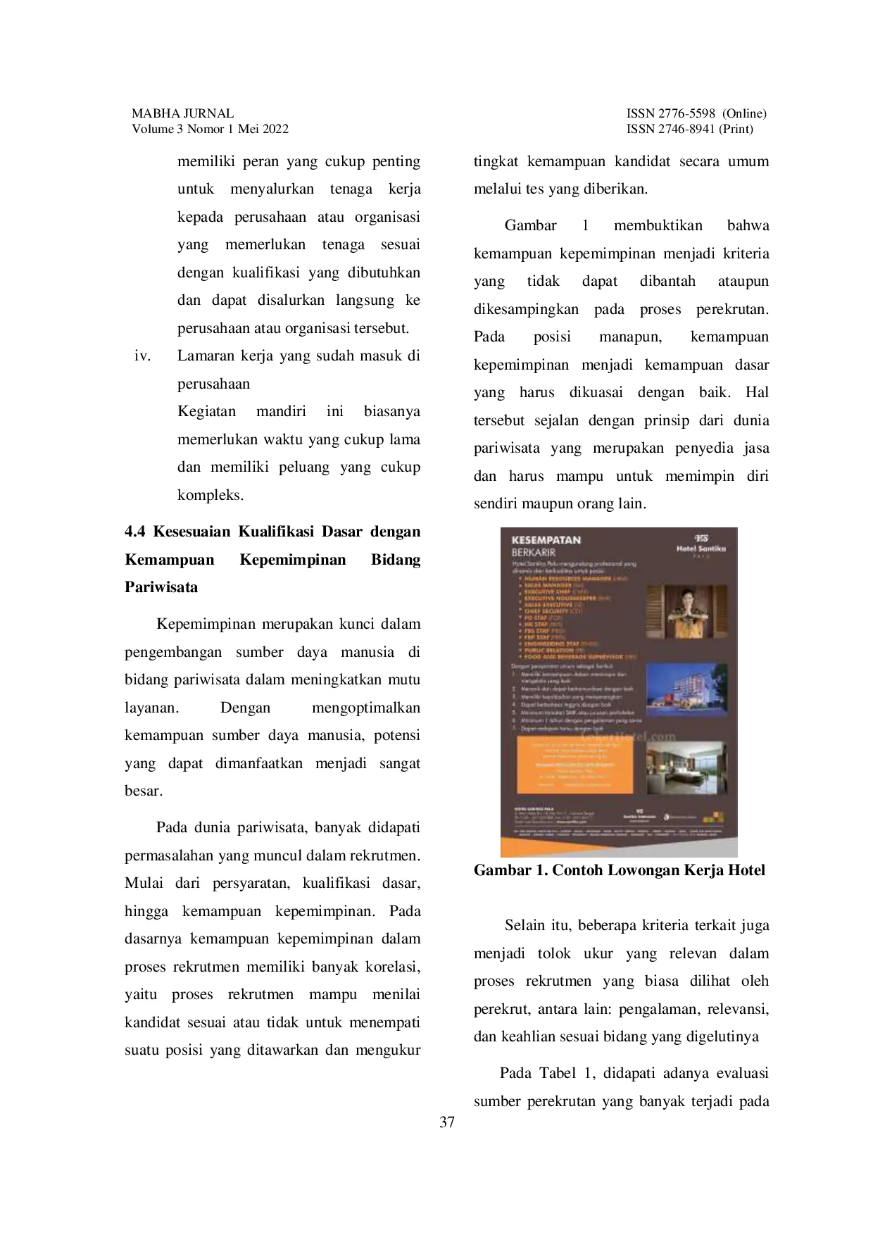 One moment, please...One moment, please...Industri pariwisata yang bergerak di bidang pelayanan mencakup hal-hal yang membutuhkan kemampuan individu dalam memimpin suatu kelompok. Kemampuan individu dalam memimpin menjadi hal yang sangat penting untuk diperhatikan di industri pariwisata. Oleh karena itu, untuk mendapatkan figur pemimpin yang tepat dalam menunjukkan kinerja, perlu ditinjau kualifikasi dasar suatu jabatan pekerjaan saat proses rekrutmen karyawan. Proses rekrutmen ini menjadi pintu awal untuk memulai suatu jabatan karir di bidang pariwisata sehingga kompetensi yang dimiliki oleh calon karyawan perlu dicari tahu kecocokannya dengan kualifikasi dasar yang diinginkan industri pariwisata. Tujuan dari penelitian ini adalah untuk menganalisis kualifikasi dasar kemampuan kepemimpinan dalam rekrutmen. Artikel ini menggunakan metode penelitian deskriptif kualitatif menggunakan studi literatur dan wawancara dengan human resources department. Hasil dari penelitian menunjukkan bahwa dengan adanya kualifikasi dasar kemampuan kepemimpinan yang dicari pada proses rekrutmen, maka para perekrut mampu untuk menemukan dan menciptakan sosok pemimpin baru dari suatu jabatan pekerjaan di bidang industri pariwisata yang berkompeten dalam bidangnya.