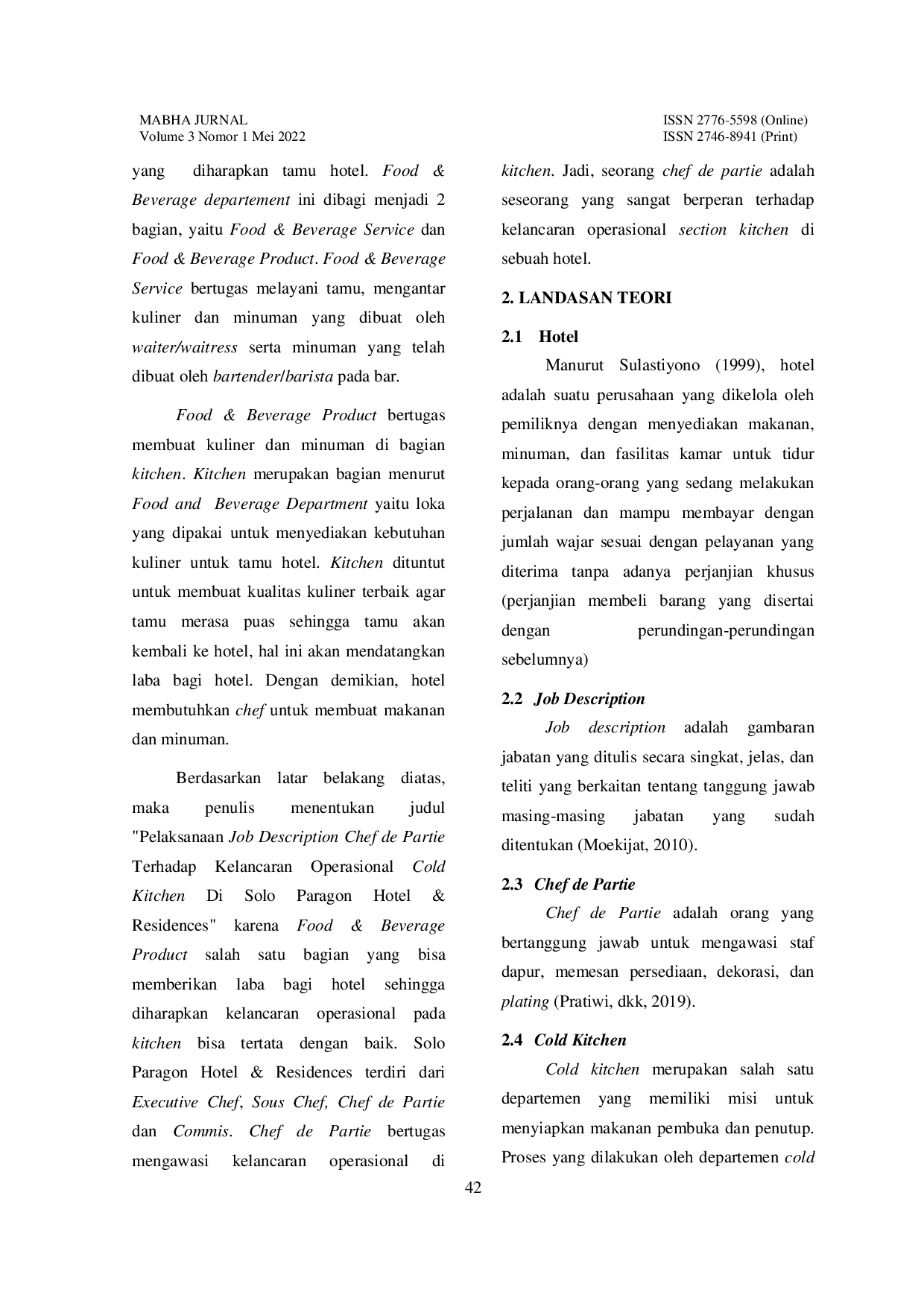 One moment, please...One moment, please...Penelitian ini bertujuan untuk mengetahui penerapan job description chef de partie untuk kelancaran cold kitchen di Solo Paragon Hotel & Residences guna menentukan implementasi job description chef agar dapat berfungsi dengan baik dari cold kitchen di Solo Hotel & Residences Paragon. Metode pengumpulan data yang digunakan dalam penelitian ini adalah metode observasi yang dilaksanakan pada tanggal 9 November 2020 sampai dengan 9 Mei 2021, metode dokumenter, dan metode angket. Pertanyaan ditujukan untuk karyawan Solo Paragon Hotel & Residences. Hasil pertama adalah deskripsi pekerjaan cold kitchen Solo Paragon Hotel & Residences, yang kedua adalah deskripsi pekerjaan chef de partie di cold kitchen Solo Paragon Hotel & Residences. Berdasarkan tanggapan atas kuisioner yang diberikan kepada chef de partie, dapat disimpulkan bahwa penetapan job description chef de partie untuk kelancaran operasional cold stove di Solo Paragon Hotel & Residences, telah diajukan 8 pertanyaan dan 6 pertanyaan yang terkadang ditanyakan oleh kepala chef cold kitchen Solo Paragon Hotel & Residences. Ketiga, berdasarkan metodologi kuesioner, pertanyaan yang diajukan kepada chef dan executive secretary dapat disimpulkan bahwa implementasi job description chef untuk kelancaran operasional cold stove di Solo Paragon Hotel & Residences meliputi 11 pertanyaan yang telah diajukan dan 3 yang terkadang ditanyakan oleh chef de partie cold kitchen Solo Paragon Hotel & Residences.