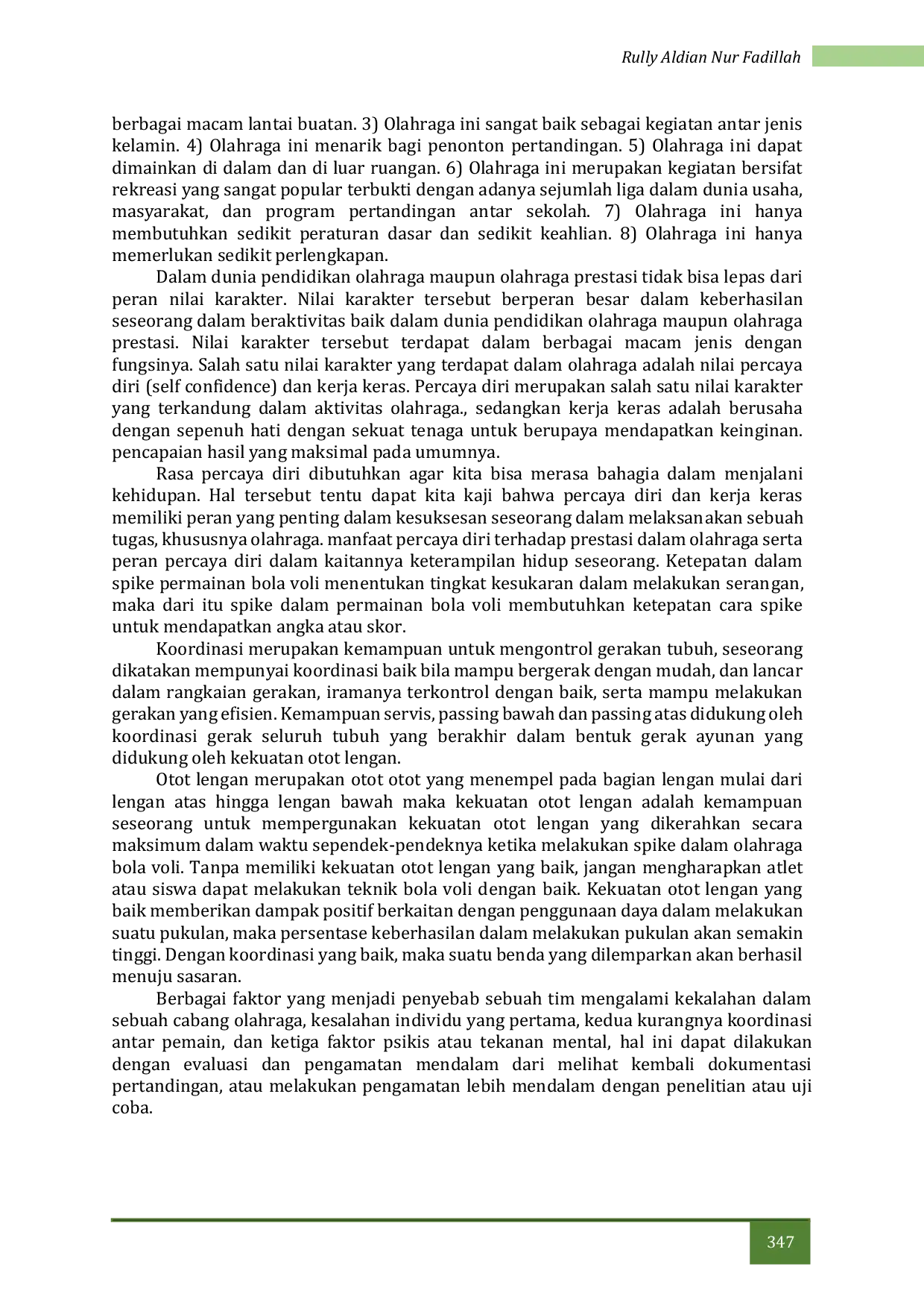 Jurnal Master Penjas & OlahragaJurnal Master Penjas & OlahragaPenelitian Ini bertujuan untuk mengetahui hubungan otot lengan (X1), koordinasi mata tangan (X2) dan percaya diri siswa (X3) terhadap hasil spike bola voli (Y). Sampel penelitian berjumlah 39 orang seluruh siswa yang mengikuti ektrakulikuler bola voli. Metode dalam penelitian ini berupa tes praktek dan penyebaran angket. Variabel koordinasi diukur dengan instrument wall past test, sementara keterampilan bola voli di ukur dengan spike, angket digunakan untuk penilaian kepercayaan diri siswa. Hasil pengujian hipotesis yang di peroleh dalam tarap signifikan a = 0.05 adalah (1) terdapat hubungan yang signifikan dari otot lengan terhadap hasil tes keterampilan spike, (2) terdapat hubungan yang signifikan dari koordinasi mata tangan terhadap hasil tes keterampilan spike bola voli, (3) terdapat hubungan yang signifikan dari percaya diri terhadap hasil tes keterampilan spike bola voli, (4) Hubungan otot lengan, koordinasi mata tangan, dan rasa percaya diri secara bersama-sama terhadap hasil tes keterampilan spike bola voli adalah sebesar 88%.