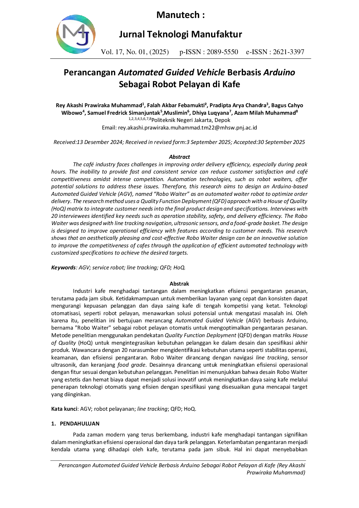 Manutech : Jurnal Teknologi ManufakturManutech : Jurnal Teknologi ManufakturIndustri kafe menghadapi tantangan dalam meningkatkan efisiensi pengantaran pesanan, terutama pada jam sibuk. Ketidakmampuan untuk memberikan layanan yang cepat dan konsisten dapat mengurangi kepuasan pelanggan dan daya saing kafe di tengah kompetisi yang ketat. Teknologi otomatisasi, seperti robot pelayan, menawarkan solusi potensial untuk mengatasi masalah ini. Oleh karena itu, penelitian ini bertujuan merancang Automated Guided Vehicle (AGV) berbasis Arduino, bernama Robo Waiter sebagai robot pelayan otomatis untuk mengoptimalkan pengantaran pesanan. Metode penelitian menggunakan pendekatan Quality Function Deployment (QFD) dengan matriks House of Quality (HoQ) untuk mengintegrasikan kebutuhan pelanggan ke dalam desain dan spesifikasi akhir produk. Wawancara dengan 20 narasumber mengidentifikasi kebutuhan utama seperti stabilitas operasi, keamanan, dan efisiensi pengantaran. Robo Waiter dirancang dengan navigasi line tracking, sensor ultrasonik, dan keranjang food grade. Desainnya dirancang untuk meningkatkan efisiensi operasional dengan fitur sesuai dengan kebutuhan pelanggan. Penelitian ini menunjukkan bahwa desain Robo Waiter yang estetis dan hemat biaya dapat menjadi solusi inovatif untuk meningkatkan daya saing kafe melalui penerapan teknologi otomatis yang efisien dengan spesifikasi yang disesuaikan guna mencapai target yang diinginkan.