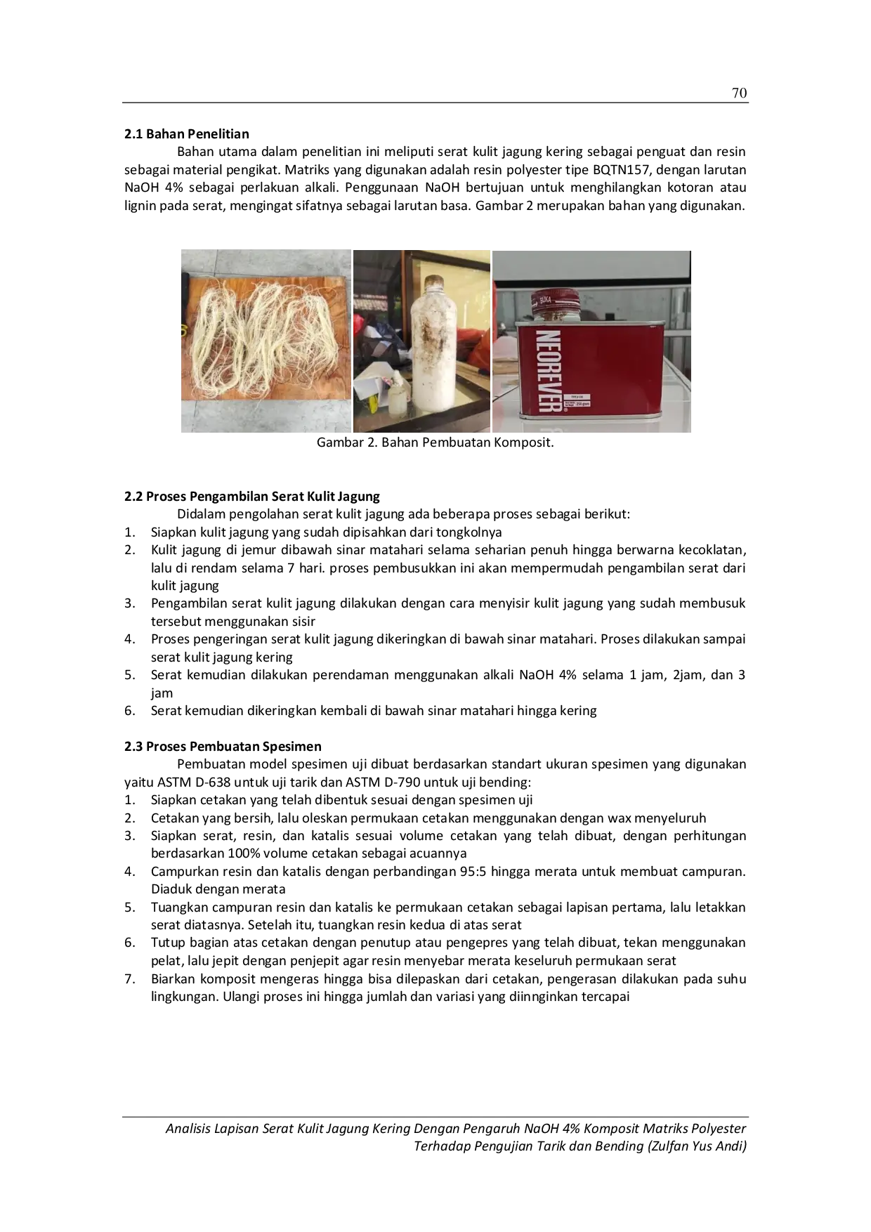 Pengujian tarik menunjukkan bahwa perendaman NaOH 4 % selama 3 jam pada suhu 90 °C menghasilkan kekuatan tarik tertinggi sebesar 21,1 MPa karena efektif menghilangkan lignin dan hemiselulosa.Sementara perendaman singkat 1 jam pada suhu 80 °C memberikan kekuatan bending tertinggi 53,0 MPa, menjaga struktur serat tetap utuh.Secara keseluruhan, penentuan durasi dan suhu perendaman yang tepat sangat memengaruhi kualitas serat kulit jagung kering sebagai penguat komposit material.