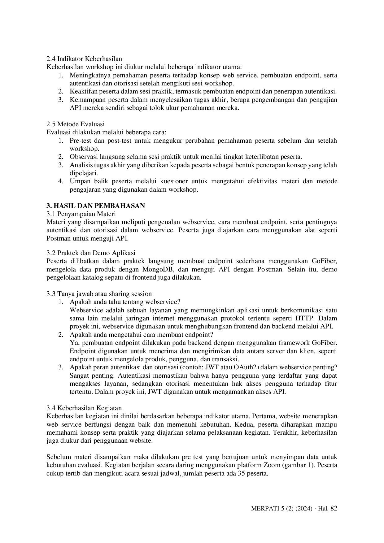 Workshop ini berhasil meningkatkan pemahaman peserta tentang web service, endpoint, serta autentikasi dan otorisasi berbasis studi kasus sepatu lokal.Peningkatan signifikan hasil pre-test–post-test membuktikan efektivitas metode praktik.Ke depan, literasi digital dan keterampilan teknis mahasiswa siap menunjang daya saing brand sepatu lokal di dunia digital.