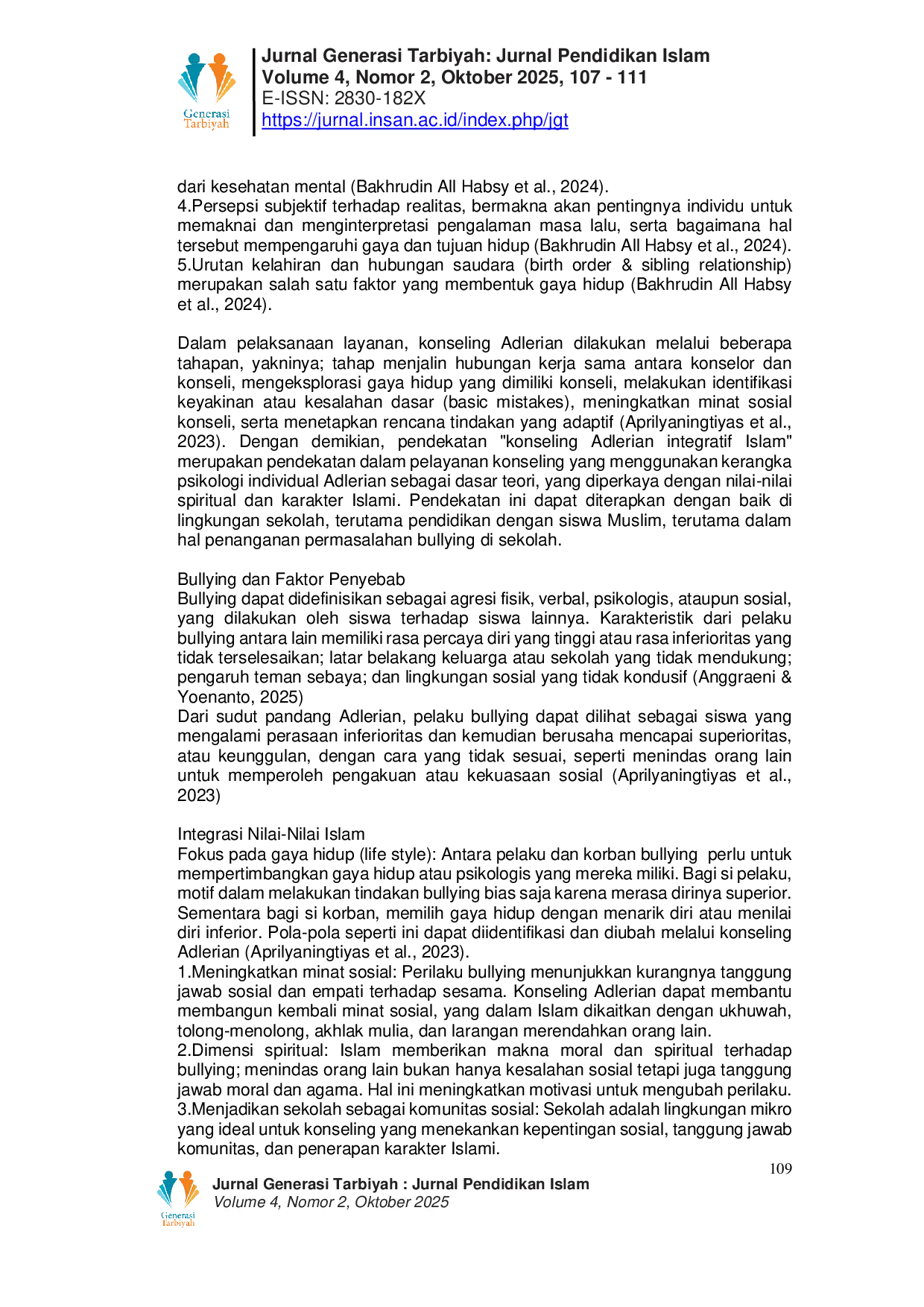 Sekolah sebagai lembaga pendidikan formal perlu mengembangkan budaya ramah anak dan bebas bullying. Untuk itu, perlu dilakukan penekanan pada pembinaan karakter dan pembelajaran sosial-emosional. Menyikapi hal tersebut, guru bimbingan dan konseling perlu menanamkan nilai social interest sebagai bentuk aktualisasi dari konsep ukhuwah dan kasih sayang dalam Islam pada diri siswa. Konseling kelompok Adlerian Integratif Islam adalah salah satu pendekatan yang perlu dikembangkan dalam praktik nyata di sekolah. Oleh karena itu, perlu dilakukan penelitian lebih lanjut tentang implementasi konseling kelompok Adlerian integratif Islam dalam penangganan kasus bullying di sekolah. Selain itu, perlu dilakukan analisis tentang faktor-faktor yang mempengaruhi keberhasilan konseling kelompok Adlerian integratif Islam dalam penangganan kasus bullying di sekolah. Dengan demikian, diharapkan dapat ditemukan solusi yang efektif dalam penangganan kasus bullying di sekolah.