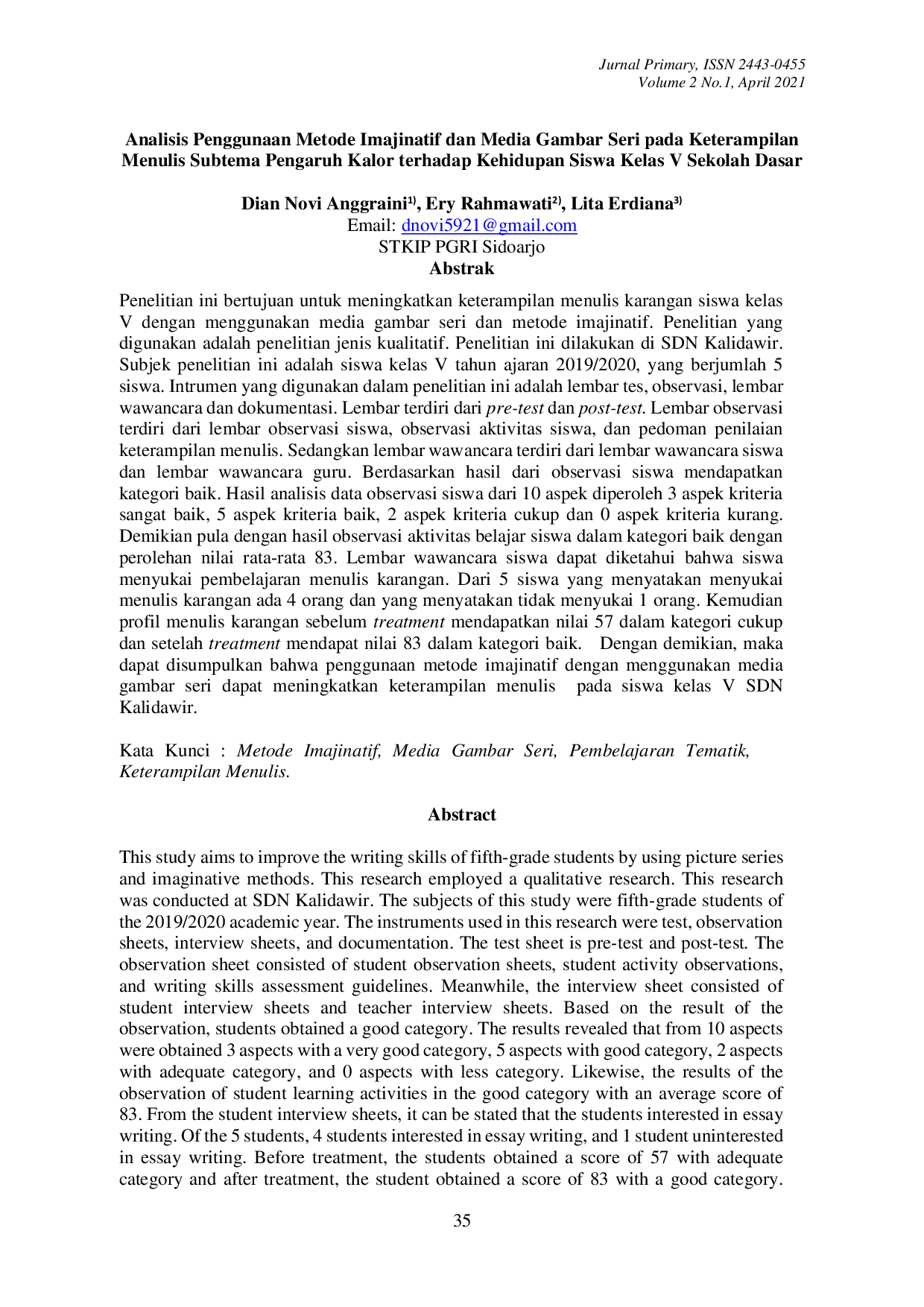Jurnal Primary (Kajian Ilmu Pendidikan Dasar dan Humaniora)Jurnal Primary (Kajian Ilmu Pendidikan Dasar dan Humaniora)Penelitian ini bertujuan untuk meningkatkan keterampilan menulis karangan siswa kelas V dengan menggunakan media gambar seri dan metode imajinatif. Penelitian yang digunakan adalah penelitian jenis kualitatif. Penelitian ini dilakukan di SDN Kalidawir. Subjek penelitian ini adalah siswa kelas V tahun ajaran 2019/2020, yang berjumlah 5 siswa. Instrumen yang digunakan dalam penelitian ini adalah lembar tes, observasi, lembar wawancara dan dokumentasi. Lembar tes terdiri dari pre-test dan post-test. Lembar observasi terdiri dari lembar observasi siswa, observasi aktivitas siswa, dan pedoman penilaian keterampilan menulis. Sedangkan lembar wawancara terdiri dari lembar wawancara siswa dan lembar wawancara guru. Berdasarkan hasil dari observasi, siswa mendapatkan kategori baik. Hasil analisis data observasi siswa dari 10 aspek diperoleh 3 aspek kriteria sangat baik, 5 aspek kriteria baik, 2 aspek kriteria cukup dan 0 aspek kriteria kurang. Demikian pula dengan hasil observasi aktivitas belajar siswa dalam kategori baik dengan perolehan nilai rata-rata 83. Lembar wawancara siswa dapat diketahui bahwa siswa menyukai pembelajaran menulis karangan. Dari 5 siswa yang menyatakan menyukai menulis karangan ada 4 orang dan yang menyatakan tidak menyukai 1 orang. Kemudian profil menulis karangan sebelum treatment mendapatkan nilai 57 dalam kategori cukup dan setelah treatment mendapat nilai 83 dalam kategori baik. Dengan demikian, maka dapat disimpulkan bahwa penggunaan metode imajinatif dengan menggunakan media gambar seri dapat meningkatkan keterampilan menulis pada siswa kelas V SDN Kalidawir.