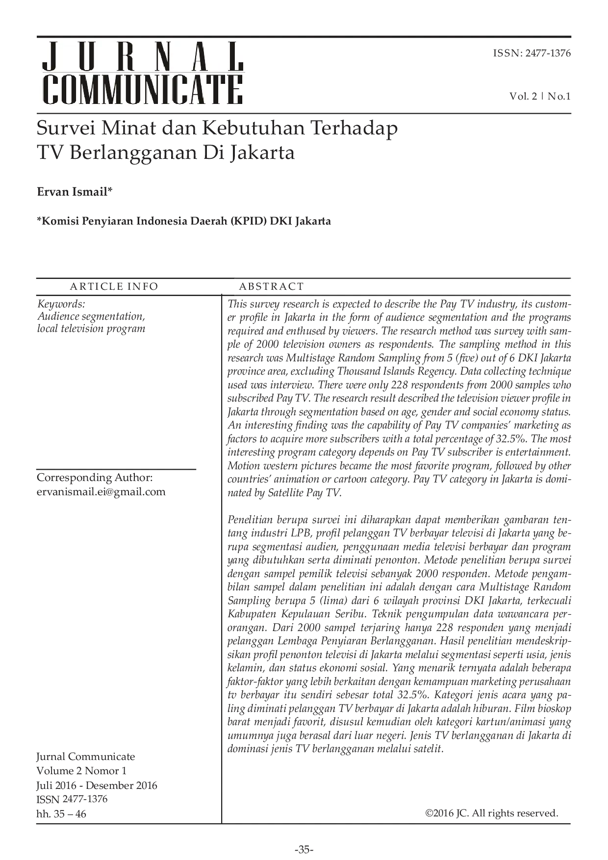 Jurnal CommunicateJurnal CommunicatePenelitian ini bertujuan untuk memberikan gambaran tentang industri TV berbayar, profil pelanggan TV berbayar di Jakarta dalam bentuk segmentasi audien, penggunaan media televisi berbayar, dan program yang dibutuhkan serta diminati penonton. Metode penelitian berupa survei dengan sampel pemilik televisi sebanyak 2000 responden. Teknik pengambilan sampel adalah Multistage Random Sampling dari 5 wilayah provinsi DKI Jakarta (kecuali Kepulauan Seribu). Data dikumpulkan melalui wawancara. Hasil penelitian mendeskripsikan profil penonton televisi di Jakarta melalui segmentasi usia, jenis kelamin, dan status ekonomi sosial. Faktor penting dalam akuisisi pelanggan adalah kemampuan marketing perusahaan TV berbayar (32.5%). Kategori program yang paling diminati adalah hiburan, khususnya film bioskop barat dan kartun/animasi dari luar negeri. TV berlangganan di Jakarta didominasi oleh TV berlangganan melalui satelit.