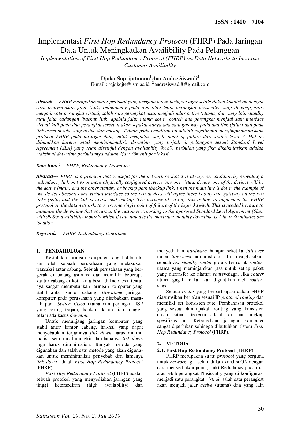 https://ejournal.istn.ac.id/index.php/sainstechhttps://ejournal.istn.ac.id/index.php/sainstechFHRP merupakan suatu protokol yang berguna untuk jaringan agar selalu dalam kondisi on dengan cara menyediakan jalur (link) redundancy pada dua atau lebih perangkat secara fisik yang dikonfigurasi menjadi satu perangkat virtual. Salah satu perangkat akan menjadi jalur aktif (utama) dan yang lain standby atau jalur cadangan (backup link) apabila jalur utama down. Tujuan penulisan ini adalah mengimplementasikan protokol FHRP pada jaringan data untuk mengatasi single point of failure pada switch layer 3, sehingga dapat meminimalkan downtime pada pelanggan sesuai Standard Level Agreement (SLA) dengan availability 99,8% per bulan, yang berarti maksimal downtime per bulan adalah 1 jam 30 menit per lokasi.
