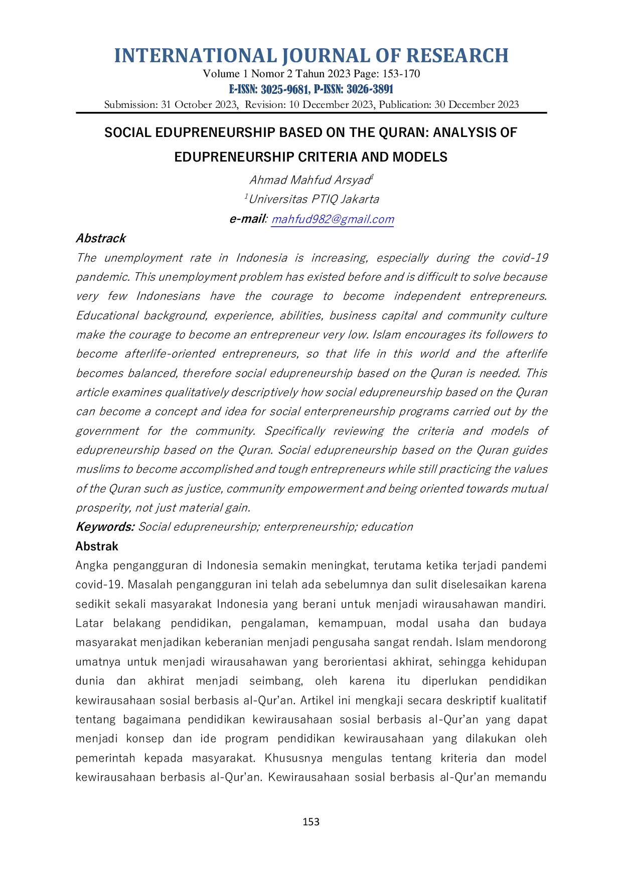International Journal of ResearchInternational Journal of ResearchAngka pengangguran di Indonesia semakin meningkat, terutama ketika terjadi pandemi covid-19. Masalah pengangguran ini telah ada sebelumnya dan sulit diselesaikan karena sedikit sekali masyarakat Indonesia yang berani untuk menjadi wirausahawan mandiri. Latar belakang pendidikan, pengalaman, kemampuan, modal usaha dan budaya masyarakat menjadikan keberanian menjadi pengusaha sangat rendah. Islam mendorong umatnya untuk menjadi wirausahawan yang berorientasi akhirat, sehingga kehidupan dunia dan akhirat menjadi seimbang, oleh karena itu diperlukan pendidikan kewirausahaan sosial berbasis al-Quran. Artikel ini mengkaji secara deskriptif kualitatif tentang bagaimana pendidikan kewirausahaan sosial berbasis al-Quran yang dapat menjadi konsep dan ide program pendidikan kewirausahaan yang dilakukan oleh pemerintah kepada masyarakat. Khususnya mengulas tentang kriteria dan model kewirausahaan berbasis al-Quran. Kewirausahaan sosial berbasis al-Quran memandu umat islam untuk menjadi pengusaha yang ulung dan tangguh dengan tetap mengamalkan nilai-nilai al-Quran seperti keadilan, pemberdayaan masyarakat dan beorientasi pada kesejahteraan bersama, bukan keuntungan materi semata.