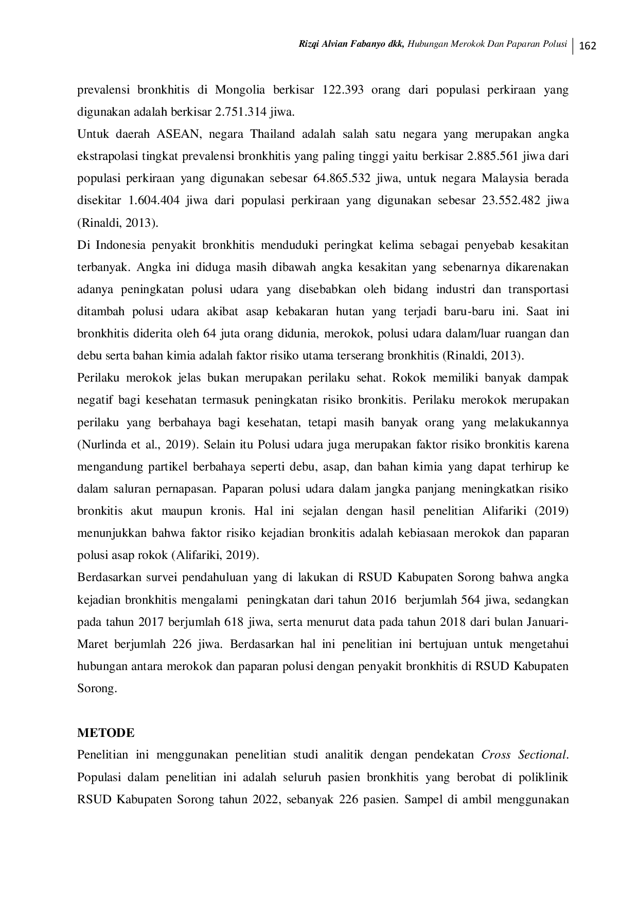 Hasil analisis statistik menunjukkan terdapat hubungan signifikan antara merokok dengan kejadian bronkhitis, sementara paparan polusi tidak menunjukkan hubungan yang signifikan.Oleh karena itu, disarankan untuk meningkatkan edukasi tentang bahaya merokok serta menyediakan layanan konseling berhenti merokok di fasilitas pelayanan kesehatan.Penelitian lebih lanjut diperlukan untuk menyelidiki pengaruh polusi udara secara mendalam, sementara penerapan kebijakan kawasan bebas rokok dan kolaborasi lintas sektor perlu diperkuat sebagai upaya pencegahan dan penanganan yang komprehensif.