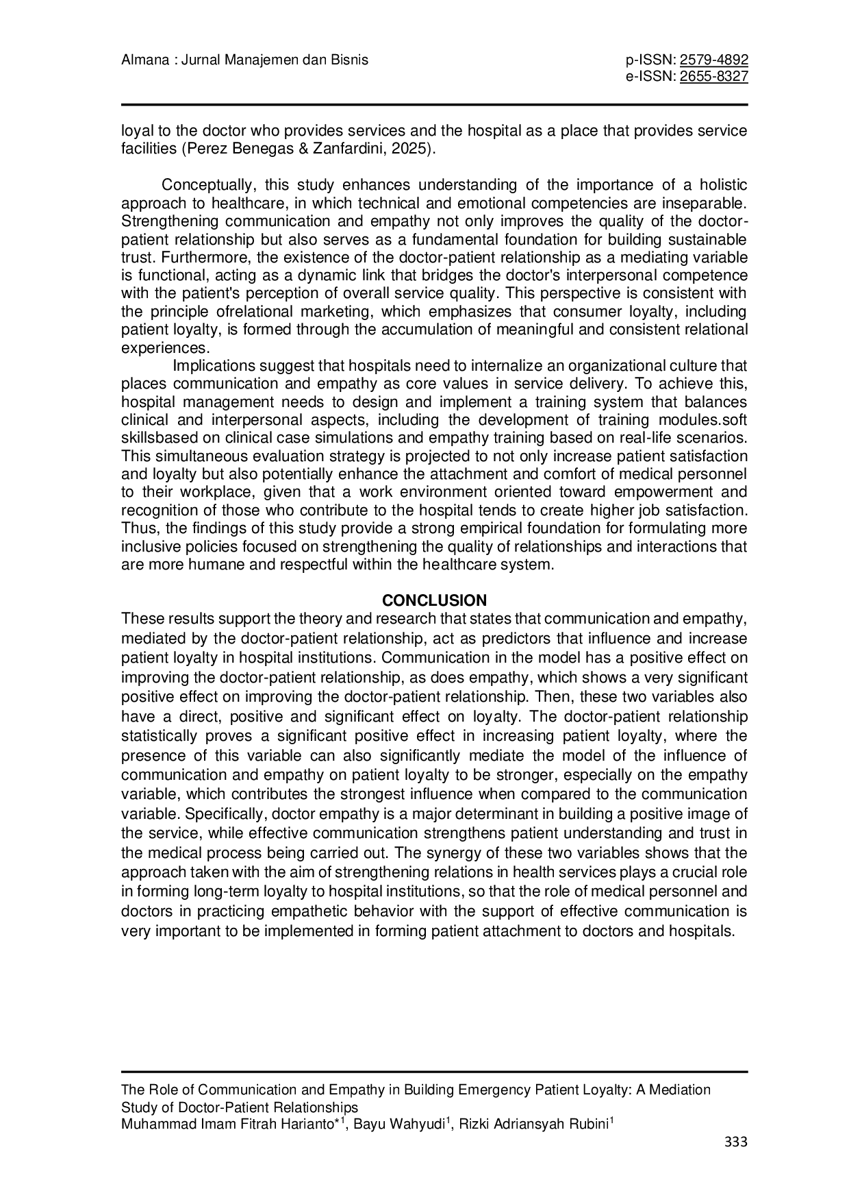 - The Role of Communication and Empathy in Building Emergency Patient Loyalty: A Mediation Study of Doctor-Patient... doi.org/10.36555/almana.v9i2.2882The Role of Communication and Empathy in Building Emergency Patient Loyalty A Mediation Study of Doctor Patient doi 10 36555 almana v9i2 2882