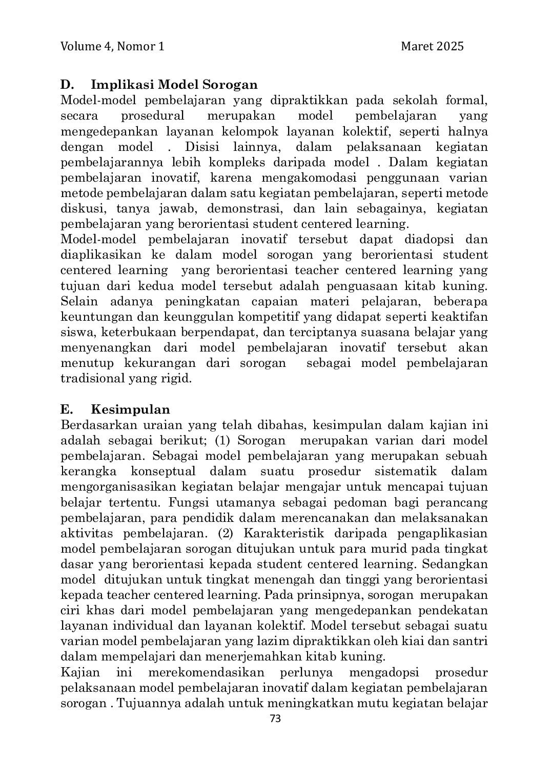 Bagaimana bentuk desain pembelajaran sorogan terintegrasi teknologi digital seperti aplikasi tafsir interaktif untuk mempermudah santri non-Jawa memahami kitab kuning? Apakah model hybrid yang menggabungkan sorogan tatap muka dengan bandongan daring dapat meningkatkan retensi belajar tanpa mengurangi nilai kekhusyukan? Selanjutnya, dapatkah penelitian longitudinal membandingkan pencapaian kompetensi bahasa Arab santri yang menjalani sorogan klasik dengan yang diberi pendekatan kontekstual berbasis projek, untuk memperkaya bukti empiris keunggulan masing-masing metode?.