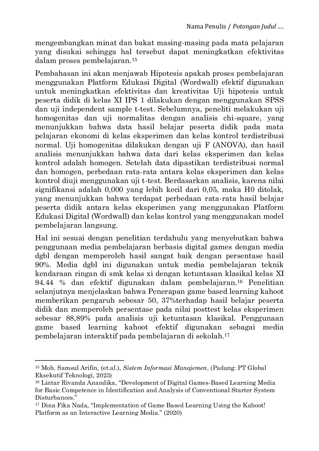 Hasil analisis menunjukkan bahwa pada pembelajaran dengan menggunakan platform edukasi digital (Wordwall), nilai pretest di kelas eksperimen menunjukkan nilai signifikansi Shapiro-Wilk sebesar 0,559, yang lebih besar dari 0,05, menandakan distribusi normal.Demikian pula, nilai signifikansi untuk posttest di kelas eksperimen adalah 0,248, juga lebih besar dari 0,05, menunjukkan distribusi normal.Pada kelas kontrol, nilai signifikansi untuk pretest adalah 0,169, yang melebihi 0,05, serta nilai signifikansi untuk posttest adalah 0,249, yang juga lebih besar dari 0,05, menunjukkan distribusi normal.Dengan demikian, dapat disimpulkan bahwa data untuk pretest dan posttest di kedua kelas, eksperimen maupun kontrol, semuanya terdistribusi normal.Keefektifan proses pembelajaran dengan menggunakan platform edukasi digital (Wordwall) memperoleh nilai rata-rata hasil belajar peserta didik pada kelas eksperimen 68,54 % yang berarti bahwa penggunaan platform edukasi digital (Wordwall) cukup efektif dalam meningkatkan hasil belajar dan kreativitas peserta didik pada mata pelajaran ekonomi di kelas XI IPS 1.Sedangkan persentase pada kelas kontrol sebesar 33, 72 % yang berarti bahwa model pembelajaran langsung kurang efektif dalam meningkatkan hasil belajar dan kreativitas peserta didik dalam mata pelajaran ekonomi di kelas XI IPS 2.Dapat disimpulkan bahwa penggunaan media platform edukasi digital (Wordwall) lebih efektif digunakan dibandingkan dengan model pembelajaran langsung terhadap hasil belajar peserta didik di kelas XI IPS 1 dan XI IPS 2 Madrasah Aliyah Negeri 1 Mandailing Natal.Proses pembelajaran dengan menggunakan platform edukasi digital dapat meningkatkan efektivitas dan kreativitas belajar peserta didik yaitu dengan adanya fitur-fitur seperti video pembelajaran, simulasi, dan permainan pendidikan, kuis yang menarik agar peserta didik dapat terlibat secara lebih aktif dalam materi pelajaran.Pembelajaran ini tidak hanya meningkatkan keterlibatan peserta didik tetapi juga memotivasi mereka untuk menggali lebih dalam konsep-konsep pelajaran sehingga dapat meningkatkan kemampuan peserta didik baik itu dari segi kognitif, afektif dan psikomotorik.
