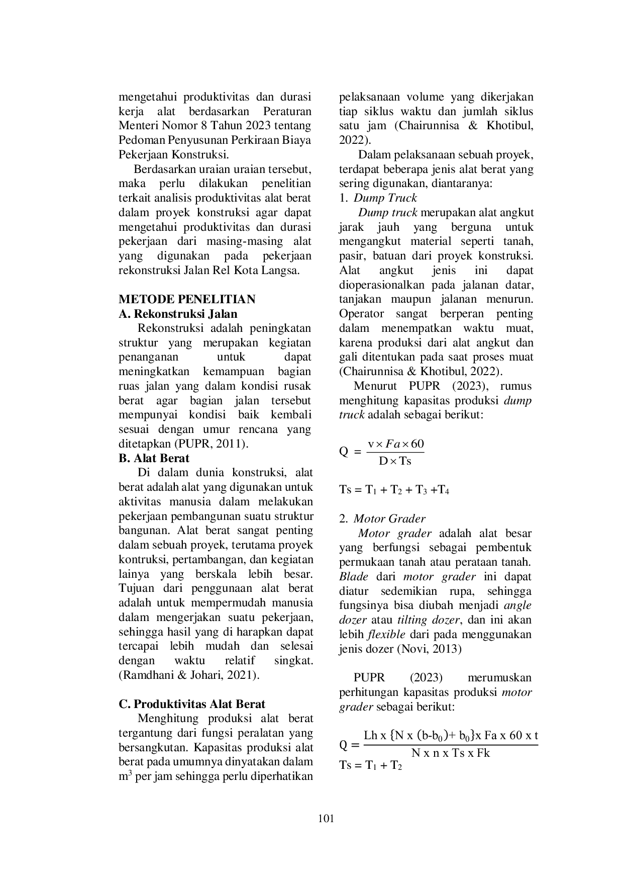 Jurnal Smart Technology dan OtomasiJurnal Smart Technology dan OtomasiJalan Rel merupakan jalan lokal primer yang memiliki peranan penting dalam mendukung perkembangan sektor-sektor ekonomi di kota Langsa, karena jalan tersebut menghubungkan pusat kegiatan nasional dengan pusat kegiatan lingkungan. Pada tahun 2024, dilakukan rekonstruksi pada Jalan Rel tersebut guna memperlancar aksesibilitas kegiatan sosial ekonomi masyarakat. Rekonstruksi Jalan Rel Kota Langsa bertujuan untuk meningkatkan kualitas pengerjaannya dilakukan dengan memperhatikan jenis material yang digunakan, pemilihan operator serta penggunaan alat berat yang sesuai standar agar hasil yang dicapai sesuai dengan rencana dan selesai dengan waktu yang telah ditentukan. Kesalahan dalam pemilihan alat berat akan mengakibatkan produktivitas yang rendah dan berdampak pada peningkatan biaya perbaikan. Tujuan penelitian ini adalah untuk mengetahui berapa produktivitas alat berat dan berapa durasi pekerjaan dari masing-masing alat yang digunakan pada pekerjaan rekonstruksi Jalan Rel Kota Langsa. Metode penelitian dilakukan dengan menghitung produktivitas alat berat berdasarkan Peraturan Menteri Nomor 8 tahun 2023 tentang Pedoman Penyusunan Perkiraan Biaya Pekerjaan Konstruksi, dan durasi pekerjaan. Hasil analisis didapatkan bahwa produktivitas alat berat pada pekerjaan LPA: dump truck = 386,352 m3/hari, motor grader = 617,143 m3/hari, vibrator compactor roller = 804,270 m3/hari, water tank = 498 m3/hari. Pada pekerjaan lapis resap pengikat: air compressor = 3486 m2/hari, asphalt distributor = 647,089 liter/hari. Pada pekerjaan asphalt concrete binder course: dump truck = 172,148 m3/hari, asphalt finisher = 804,270 ton/hari, tandem roller = 401,017 m3/hari, pneumatic tire roller = 365,776 m3/hari. Waktu yang dibutuhkan alat berat untuk dalam pelaksanaan pekerjaan LPA = 2 hari, pekerjaan lapis resap pengikat = 1 hari, dan pekerjaan AC-BC = 2 hari.