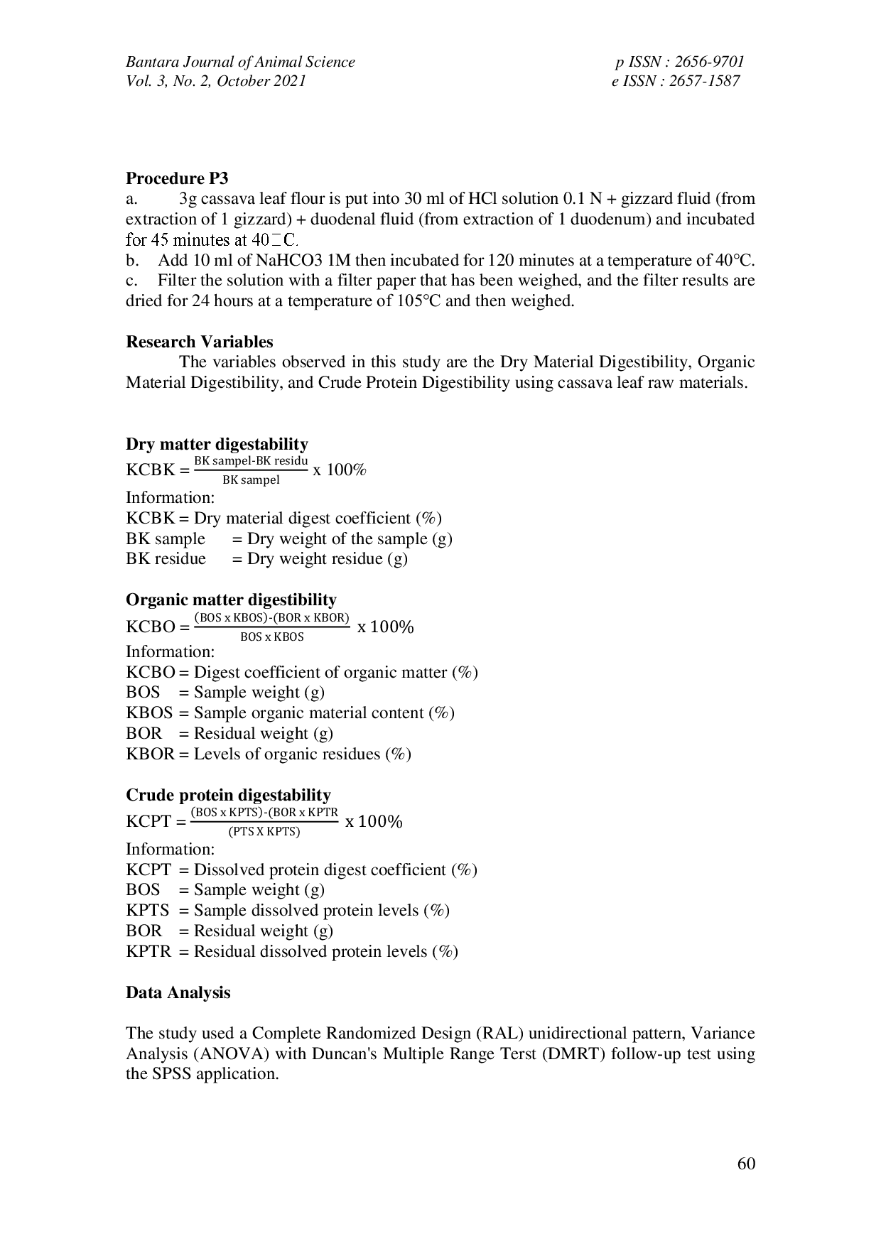 Bantara Journal of Animal ScienceBantara Journal of Animal ScienceCassava leaves are an alternative feed material that can be a feed material with sufficient protein content. The study aimed to determine the effect of gizzard and duodenal fluids on in vitro digesting measurements of cassava leaves. The study used a Complete Randomized Design (RAL) unidirectional pattern, Variance Analysis (ANOVA) with Duncans Multiple Range Terst (DMRT) follow-up test using the SPSS application. The study used 4 treatments and 3 repeats: P0: No digestive fluids (controls), P1: Gizzard fluid, P2: Duodenal fluid, P3: A mixture of gizzard and duodenal fluids. The observed variables are the Dry Material Digest Coefficient (KCBK), the Organic Material Digest Coefficient (KCBO), and the Dissolved Protein Digest Coefficient (KCPT). The results of the study that the use of gizzard fluid in in vitro digestion measurements was better in increasing the value of in vitro digestant of cassava leaves. The use of gizzard fluid can increase the digestibility coefficient of organic matter (KCBO) by 21.2160% and the dissolved protein digest coefficient (KCPT) by 50.4620%.