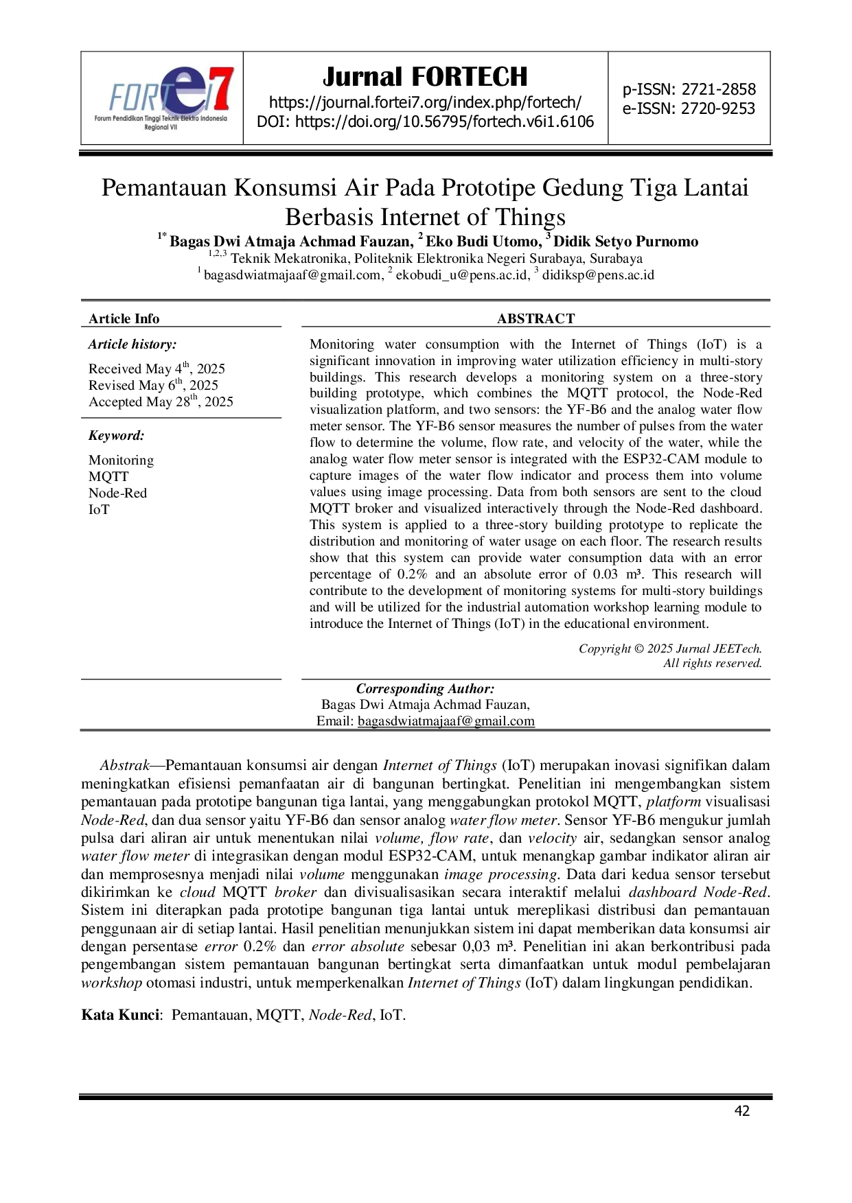 Jurnal FORTECHJurnal FORTECHPemantauan konsumsi air dengan Internet of Things (IoT) merupakan inovasi signifikan dalam meningkatkan efisiensi pemanfaatan air di bangunan bertingkat. Penelitian ini mengembangkan sistem pemantauan pada prototipe bangunan tiga lantai, yang menggabungkan protokol MQTT, platform visualisasi Node-Red, dan dua sensor yaitu YF-B6 dan sensor analog water flow meter. Sensor YF-B6 mengukur jumlah pulsa dari aliran air untuk menentukan nilai volume, flow rate, dan velocity air, sedangkan sensor analog water flow meter di integrasikan dengan modul ESP32-CAM, untuk menangkap gambar indikator aliran air dan memprosesnya menjadi nilai volume menggunakan image processing. Data dari kedua sensor tersebut dikirimkan ke cloud MQTT broker dan divisualisasikan secara interaktif melalui dashboard Node-Red. Sistem ini diterapkan pada prototipe bangunan tiga lantai untuk mereplikasi distribusi dan pemantauan penggunaan air di setiap lantai. Hasil penelitian menunjukkan sistem ini dapat memberikan data konsumsi air dengan persentase error 0.2% dan error absolute sebesar 0,03 m³. Penelitian ini akan berkontribusi pada pengembangan sistem pemantauan bangunan bertingkat serta dimanfaatkan untuk modul pembelajaran workshop otomasi industri, untuk memperkenalkan Internet of Things (IoT) dalam lingkungan pendidikan.