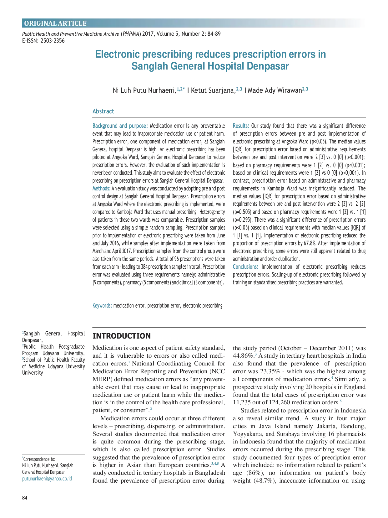 Public Health and Preventive Medicine ArchivePublic Health and Preventive Medicine ArchiveKesalahan pengobatan adalah setiap kejadian yang dapat dicegah yang dapat menyebabkan penggunaan obat yang tidak tepat atau membahayakan pasien. Kesalahan resep, salah satu komponen dari kesalahan pengobatan, di Rumah Sakit Umum Sanglah Denpasar cukup tinggi. Pemberian resep elektronik telah diuji coba di Ruang Angsoka, Rumah Sakit Umum Sanglah Denpasar untuk mengurangi kesalahan resep. Namun, evaluasi implementasi tersebut belum pernah dilakukan. Studi ini bertujuan untuk mengevaluasi efek pemberian resep elektronik terhadap kesalahan resep di Rumah Sakit Umum Sanglah Denpasar. Studi evaluasi dilakukan dengan mengadopsi desain kontrol sebelum dan sesudah di Rumah Sakit Umum Sanglah Denpasar. Kesalahan resep di Ruang Angsoka tempat pemberian resep elektronik diimplementasikan, dibandingkan dengan Ruang Kamboja yang menggunakan pemberian resep manual. Heterogenitas pasien di kedua ruang ini sebanding. Sampel resep dipilih menggunakan random sampling sederhana. Sampel resep sebelum implementasi pemberian resep elektronik diambil dari Juni dan Juli 2016, sedangkan sampel setelah implementasi diambil dari Maret dan April 2017. Sampel resep dari kelompok kontrol juga diambil dari periode yang sama. Total 96 resep diambil dari masing-masing kelompok – menghasilkan total 384 sampel resep. Kesalahan resep dievaluasi menggunakan tiga persyaratan yaitu: administratif (9 komponen), farmasi (5 komponen) dan klinis (3 komponen). Studi kami menemukan bahwa terdapat perbedaan signifikan dari kesalahan resep antara sebelum dan sesudah implementasi pemberian resep elektronik di Ruang Angsoka (p<0,05). Implementasi pemberian resep elektronik mengurangi proporsi kesalahan resep sebesar 67,8%. Setelah implementasi pemberian resep elektronik, beberapa kesalahan masih tampak terkait pemberian obat dan duplikasi pesanan.