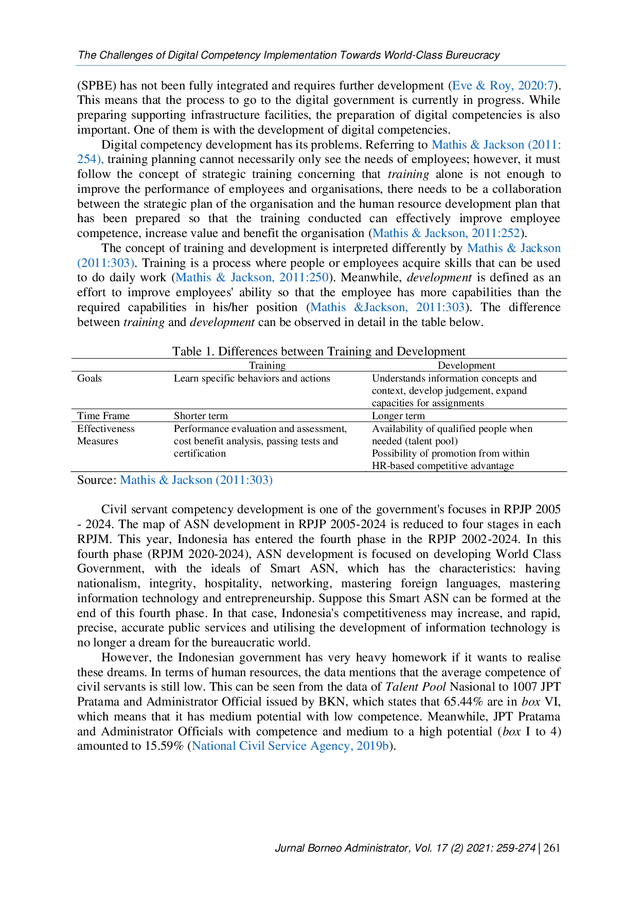 jurnal borneo administratorjurnal borneo administratorRevolusi industri 4.0 menciptakan berbagai pemanfaatan teknologi informasi di setiap sektor, menawarkan efisiensi dalam setiap bagian kehidupan. Akibatnya, pemerintah perlu meresponsnya dalam praktik pelayanan publik. Oleh karena itu, kompetensi digital wajib bagi Pegawai Negeri Sipil Indonesia. Karena kurangnya kompetensi PNS dalam penggunaan teknologi dan lingkungan birokrasi, pemerintah Indonesia menganggap ini sebagai tantangan besar. Selain itu, peningkatan kompetensi digital harus dilakukan dari pelatihan dan pengembangan. Dengan menggunakan metode deskriptif kualitatif, makalah ini menawarkan gambaran tantangan dan solusi dalam implementasi kompetensi digital di sektor publik.