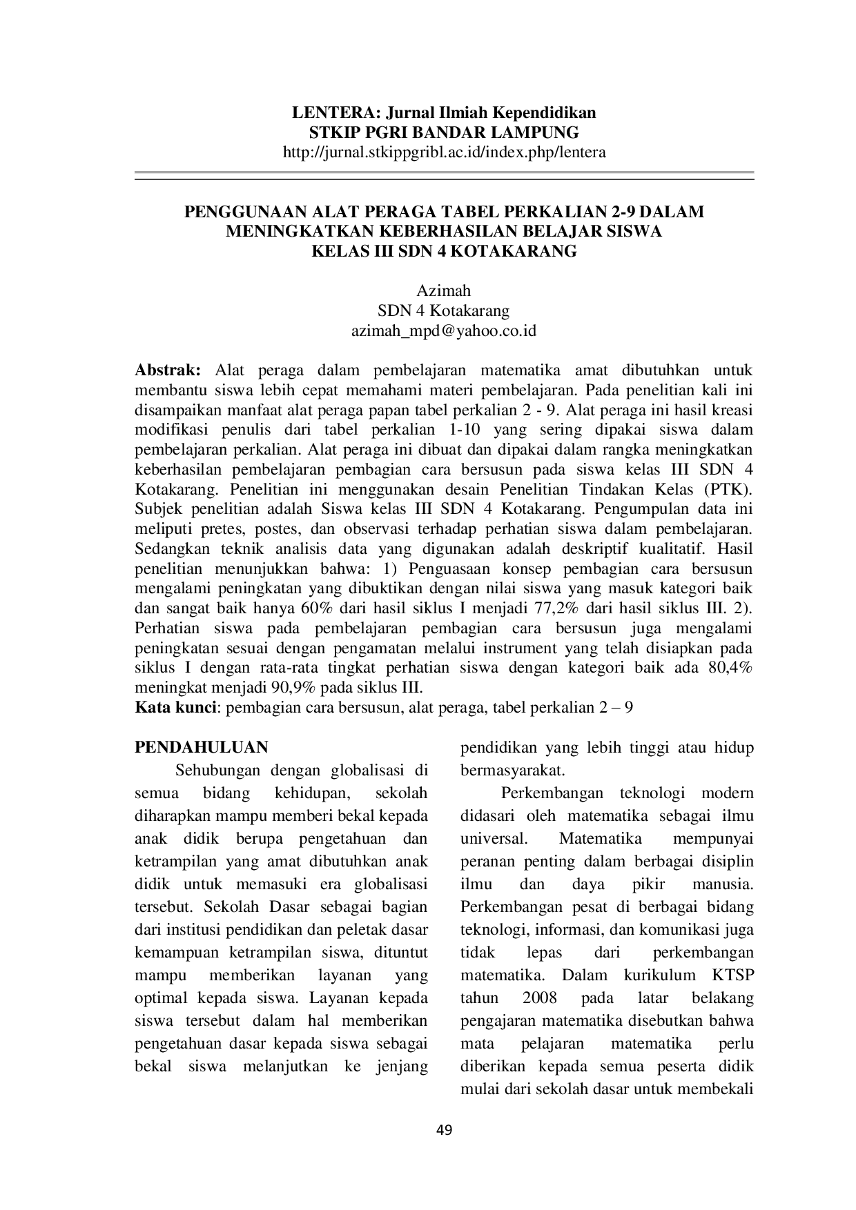 Penggunaan alat peraga tabel perkalian 2-9 dapat digunakan untuk meningkatkan keberhasilan pembelajaran pembagian serta peringkat siswa dalam pembelajaran pembagian cara bersusun pada siswa kelas III.Untuk penguasaan konsep pembagian cara bersusun, siswa yang masuk dalam kategori sangat baik sebanyak 54,5% dan 22,7% dalam kategori baik.Sedangkan siswa yang belum mencapai kategori baik masih dalam kategori cukup, sedikit kurang, dan sangat kurang.