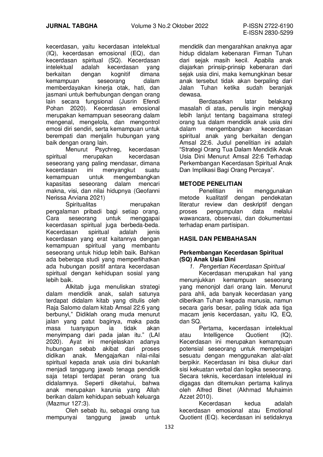 JURNAL TABGHAJURNAL TABGHAKecerdasan spiritual merupakan salah satu hal penting dimiliki oleh anak usia dini sebagai penerus bangsa yang diharapkan dapat memberikan sumbangsih positif bagi perkembangan bangsa Indonesia dimasa mendatang. Mengembangkan kecerdasan spiritual ini perlu dimulai sejak anak berusia dini sebagai pondasi bagi perkembangan di tahap selanjutnya. Penelitian dengan judul Strategi Orang Tua dalam Mendidik Anak Usia Dini menurut Amsal 22:6 terhadap Perkembangan Kecerdasan Spiritual dan Penerapannya Pada Gereja Masa Kini, memiliki rumusan masalah bagaimana mengembangkan kecerdasan spiritual dan bagaimana strategi orang tua dalam mendidik anak usia dini menurut Amsal 22:6. Adapun tujuan penelitian ini adalah untuk mengetahui cara mengembangkan kecerdasan spiritual anak usia dini dan bagaimana strategi orang tua dalam mendidik anak usia dini menurut Amsal 22:6. Berdasarkan hasil penelitian dan analisa data yang dilakukan, diperoleh kesimpulan strategi orang tua dalam mendidik anak usia dini memiliki pengaruh terhadap perkembangan kecerdasan spiritual anak. Dalam menetapkan strategi mendidik anak tentang pentingnya perkembangan kecerdasan spiritual anak usia dini menurut Amsal 22:6, dibutuhkan pemahaman dari orang tua dan teladan orang tua didalam kehidupan sehari-hari.