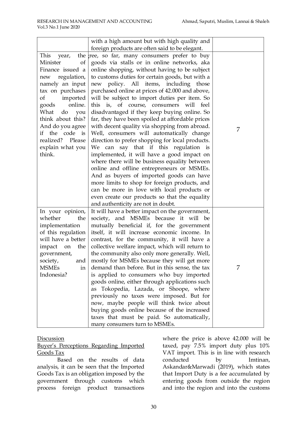 Hasil penelitian ini menunjukkan bahwa sebagian besar pembeli setuju dengan implementasi peraturan terbaru Kementerian Keuangan, Bea Cukai mengenai pengenaan pajak barang impor bagi mereka yang melakukan transaksi online atau melalui e-commerce karena beberapa alasan, yaitu karena dengan peraturan ini akan ada banyak dampak baru baik bagi pemerintah, UMKM, dan masyarakat.Perlu adanya sosialisasi yang lebih masif agar implementasi peraturan ini berjalan lancar dan memberikan manfaat yang optimal bagi semua pihak.Ke depannya, penelitian lanjutan dapat dilakukan untuk mengukur dampak regulasi ini terhadap pertumbuhan UMKM lokal dan perilaku konsumen dalam berbelanja online.