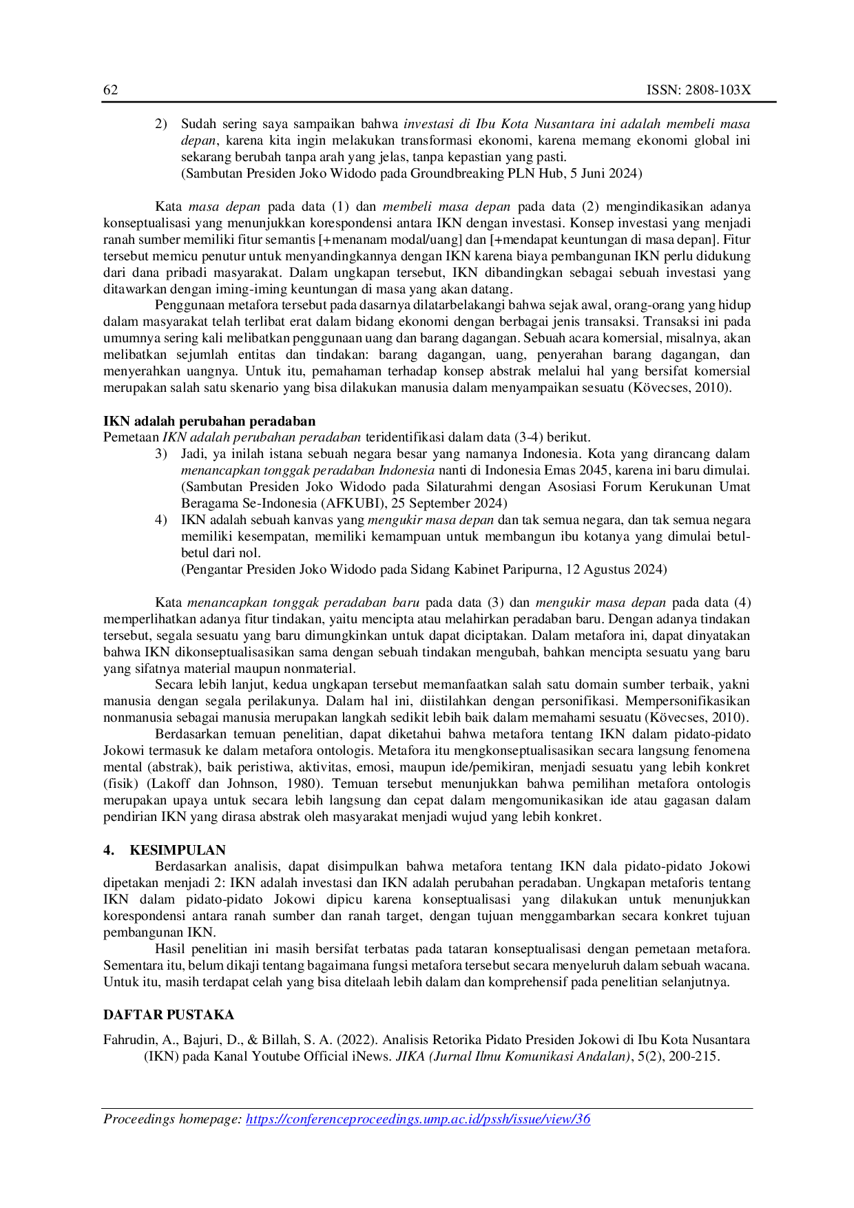 Proceedings Series on Social Sciences & HumanitiesProceedings Series on Social Sciences & HumanitiesIbu Kota Nusantara (IKN) merupakan ibu kota baru negara Indonesia yang sedang dibangun di Provinsi Kalimantan Timur yang mendapat tanggapan pro dan kontra dari masyarakat. Namun, Presiden Jokowi tetap melaksanakan pembangunan disertai dengan penyosialisasian ide/gagasan IKN menjadi lebih konkret dengan pemanfaatan metafora melalui pidato. Berdasarkan realita itu, penelitian ini mengkaji metafora tentang IKN dalam pidato-pidato Jokowi. Penelitian ini berjenis kualitatif. Data penelitian berupa kalimat yang mengandung ungkapan metaforis tentang IKN yang disediakan dari pidato-pidato Jokowi tahun 2023-2024 yang terarsip pada web Kementerian Sekretariat Negara Republik Indonesia. Data dikumpulkan dengan metode simak dan teknik catat. Data dianalisis dengan metode padan referensial dengan teknik hubung banding menyamakan hal pokok. Berdasarkan analisis data, ditemukan dua pemetaan tentang IKN yang tergolong sebagai metafora ontologis, yakni IKN adalah investasi dan IKN adalah perubahan peradaban. Temuan itu menunjukkan adanya korespondensi antara ranah sumber dan ranah target dalam mengkonkretkan ide/gagasan tentang IKN.