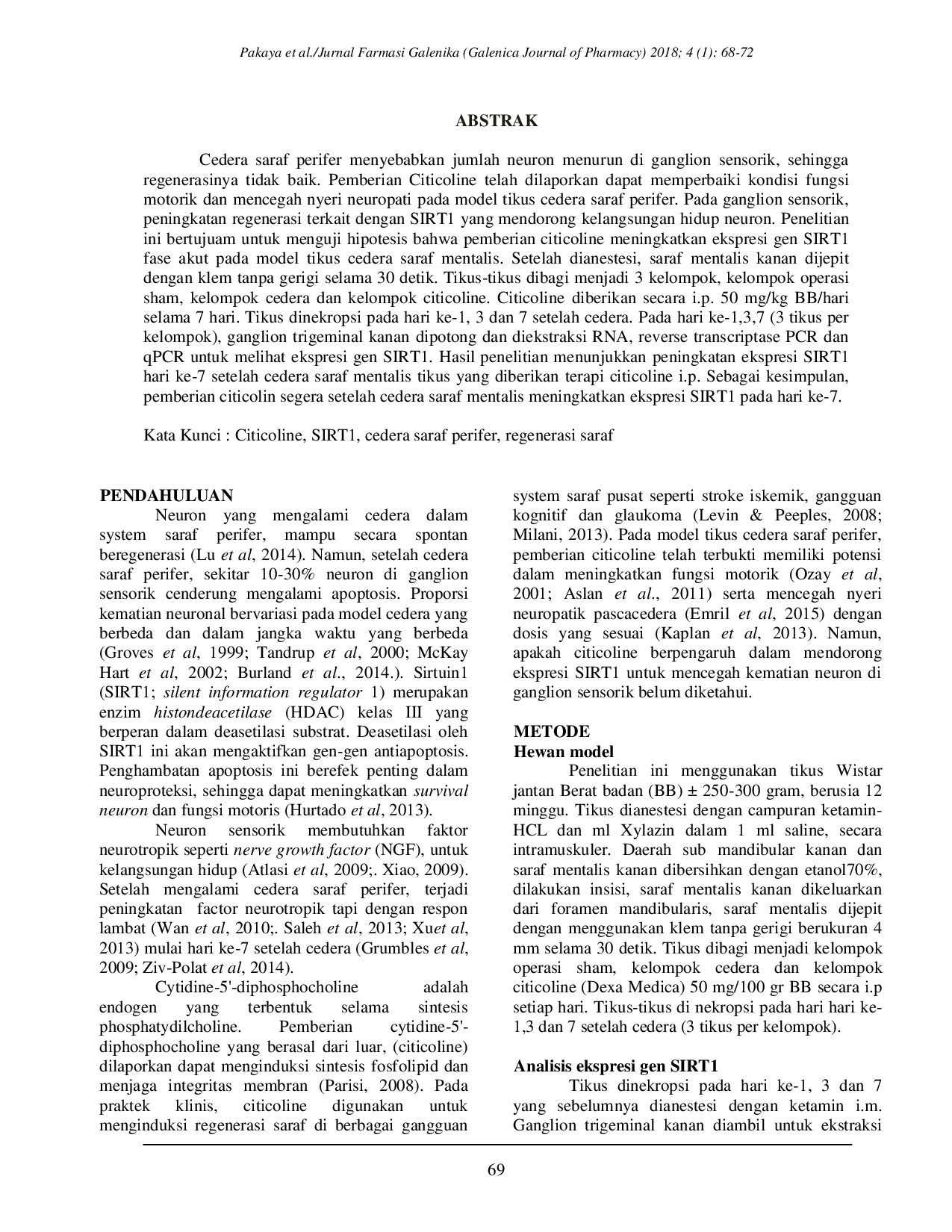 Jurnal Farmasi Galenika (Galenika Journal of Pharmacy) (e-Journal)Jurnal Farmasi Galenika (Galenika Journal of Pharmacy) (e-Journal)Cedera saraf perifer menyebabkan jumlah neuron menurun di ganglion sensorik, sehingga regenerasinya tidak baik. Pemberian Citicoline telah dilaporkan dapat memperbaiki kondisi fungsi motorik dan mencegah nyeri neuropati pada model tikus cedera saraf perifer. Pada ganglion sensorik, peningkatan regenerasi terkait dengan SIRT1 yang mendorong kelangsungan hidup neuron. Penelitian ini bertujuam untuk menguji hipotesis bahwa pemberian citicoline meningkatkan ekspresi gen SIRT1 fase akut pada model tikus cedera saraf mentalis. Setelah di anestesi, saraf mentalis kanan dijepit dengan klem tanpa gerigi selama 30 detik. Tikus-tikus dibagi menjadi 3 kelompok, kelompok operasi sham, kelompok cedera dan kelompok citicoline. Citicoline diberikan secara i.p. 50 mg/kg BB/hari selama 7 hari. Tikus dinekropsi pada hari ke-1, 3 dan 7 setelah cedera. Pada hari ke-1,3,7 (3 tikus per kelompok), ganglion trigeminal kanan dipotong dan diekstraksi RNA, reverse transcriptase PCR dan qPCR untuk melihat ekspresi gen SIRT1. Hasil penelitian menunjukkan peningkatan ekspresi SIRT1 hari ke-7 setelah cedera saraf mentalis tikus yang diberikan terapi citicoline i.p. Sebagai kesimpulan, pemberian citicolin segera setelah cedera saraf mentalis meningkatkan ekspresi SIRT1 pada hari ke-7.