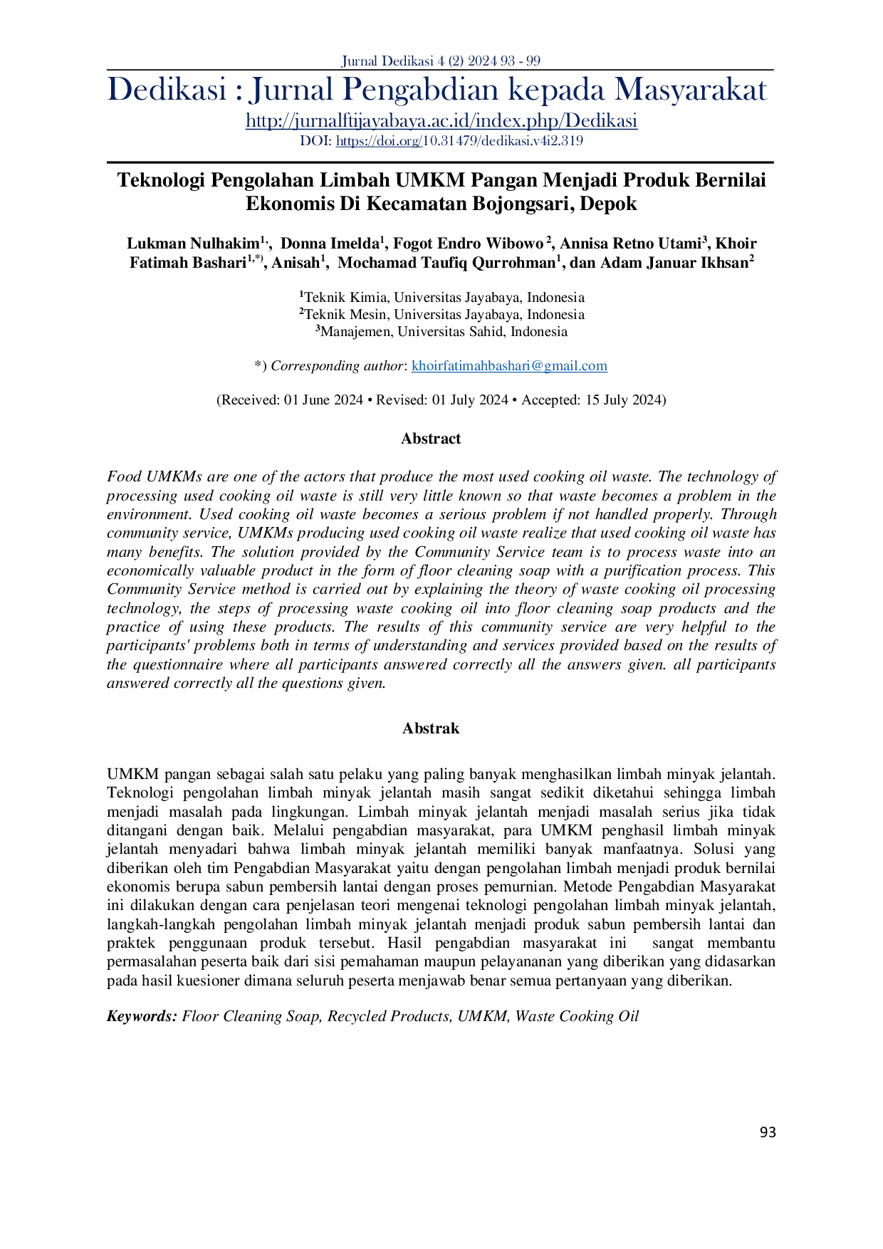 - Teknologi Pengolahan Limbah UMKM Pangan Menjadi Produk Bernilai Ekonomis Di Kecamatan Bojongsari, Depok... jurnalftijayabaya.ac.id/index.php/Dedikasi/article/view/319Teknologi Pengolahan Limbah UMKM Pangan Menjadi Produk Bernilai Ekonomis Di Kecamatan Bojongsari Depok jurnalftijayabaya ac index php Dedikasi article view 319