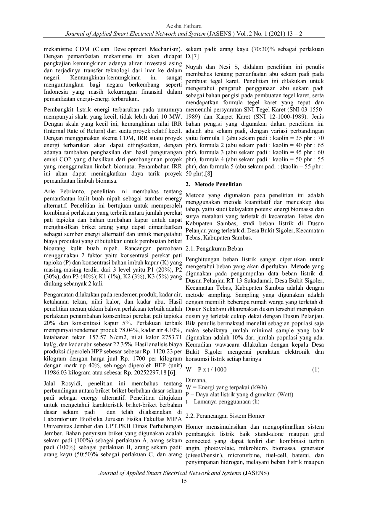 Journal of Applied Smart Electrical Network and SystemsJournal of Applied Smart Electrical Network and SystemsListrik merupakan kebutuhan primer bagi masyarakat. Energi yang tidak akan pernah habis ketersediaannya adalah energi dari radiasi sinar matahari. Indonesia negara agraris dapat memanfaatkan energi alternatif dengan pemanfaatan energy biomassa, salah satunya limbah sekam padi dan jerami. Berdasarkan data dari BMKG Stasiun Paloh, Kabupaten Sambas memiliki intensitas sinar matahari yang cukup besar dikarenakan terletak tepat dibawah garis katulistiwa. Intensitas cahaya pada musim kemarau bias mencapai 6 jam dalam periode waktu 8 jam penyinaran matahari yaitu dari jam 8.00 – 16.00. Jika di konversikan dapat menghasilkan energi sebesar 38,01 mj/m2/hari. Sedangkan untuk potensi biomassa dari data ang diperoleh dari BPS Kabupaten Sambas di Kecamatan Tebas terdapat lahan sawah seluas 6.730 ha. Dari luas tanah persawahan tersebut dapat menghasilkan 403 ton limbah sekam padi dan jerami dalam satu hari selama 1 tahun dapat menghasilkan 5 juta Mj/hari. Dari data potensi dikonversikan menggunakan Software HOMER. Hasil dari analisis konversi optimalisasi energi terbarukan untuk pembangkit tenaga listrik yang memiliki puncak daya tahunan 45kW dan konsumsi energi harian 330kWh/hari didapatkan bahwa potensi limbah sekam padi dan jerami adalah yang paling optimal, yaitu hanya memerlukan modal awal (initial capital) sebesar $ 67.120 dengan total net present cost (NPC) minimum. Listrik dari biaya sistem juga minumum yaitu sebesar US $ 0,005/kWh. Dan dalam analisis ekonomi teknik, pemodelan sistem ini memerlukan waktu balik modal yaitu sekitar 11 tahun tanpa tagihan grid dan 5 tahun dengan tagihan grid. Sedangkan konversi menggunakan PV di perlukan Modal yang lebih besar dan balik modal lebih lama.