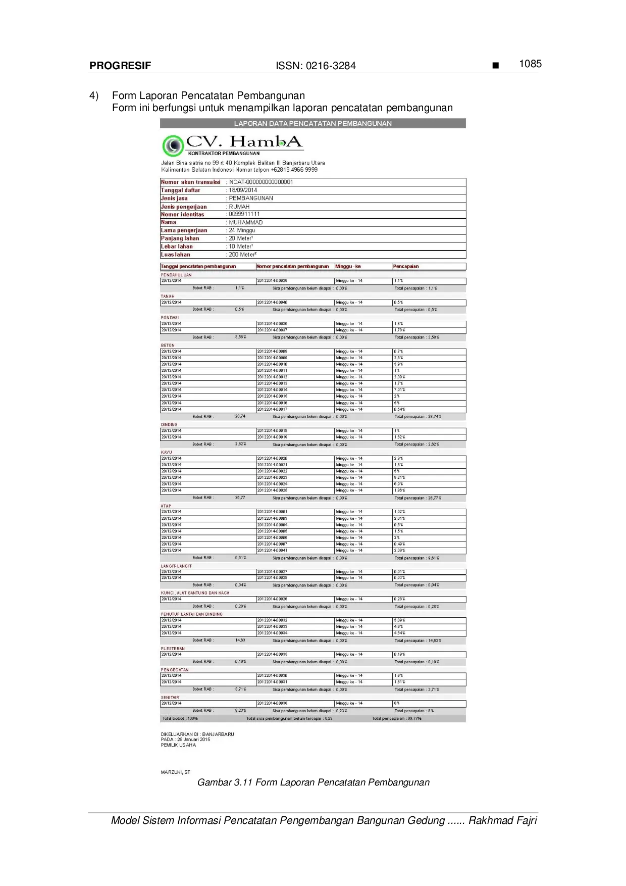 Progresif: Jurnal Ilmiah KomputerProgresif: Jurnal Ilmiah KomputerInformasi yang akurat sangat penting untuk menunjang kelangsungan transaksi yang baik, dalam hal mempermudah dan mendukung kemajuan perusahaan. Namun, apabila informasi diterima secara kurang akurat, maka dapat mengakibatkan kerugian pada perusahaan. Pemeliharaan maupun penyajian informasi yang baik, cepat, dan akurat sangat membantu peningkatan mutu kinerja suatu perusahaan menjadi lebih baik. Salah satu faktor yang mempengaruhi keberhasilan peningkatan kinerja perusahaan sangat bergantung pada bagaimana suatu perusahaan mengelola informasi dan menjadikannya lebih sempurna dengan cara sistem manajemen informasi yang baik. Sistem Informasi Pencatatan Pembangunan adalah bagian dari sistem informasi berbasis komputer yang dipakai untuk mendukung pengelolaan dan pendataan data-data kontraktor. Sistem Informasi Pencatatan Pembangunan adalah sistem yang digunakan kontraktor untuk pengolahan data kontraktor dari satuan bahan, harga upah dan bahan, jenis analisa SNI, rencana anggaran biaya, sampai pembobotan rencana anggaran biaya dan pencatatan pembangunan. Hasil pengujian aplikasi diharapkan dapat menunjukkan kemudahan dalam pengelolaan data kontraktor.