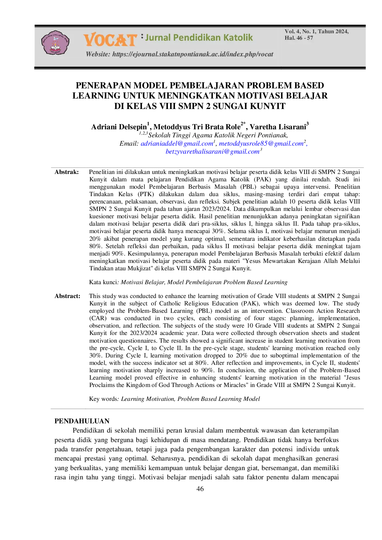 Vocat : Jurnal Pendidikan KatolikVocat : Jurnal Pendidikan KatolikPenelitian ini dilakukan untuk meningkatkan motivasi belajar peserta didik kelas VIII di SMPN 2 Sungai Kunyit dalam mata pelajaran Pendidikan Agama Katolik (PAK) yang dinilai rendah. Studi ini menggunakan model Pembelajaran Berbasis Masalah (PBL) sebagai upaya intervensi. Penelitian Tindakan Kelas (PTK) dilakukan dalam dua siklus, masing-masing terdiri dari empat tahap: perencanaan, pelaksanaan, observasi, dan refleksi. Subjek penelitian adalah 10 peserta didik kelas VIII SMPN 2 Sungai Kunyit pada tahun ajaran 2023/2024. Data dikumpulkan melalui lembar observasi dan kuesioner motivasi belajar peserta didik. Hasil penelitian menunjukkan adanya peningkatan signifikan dalam motivasi belajar peserta didik dari pra-siklus, siklus I, hingga siklus II. Pada tahap pra-siklus, motivasi belajar peserta didik hanya mencapai 30%. Selama siklus I, motivasi belajar menurun menjadi 20% akibat penerapan model yang kurang optimal, sementara indikator keberhasilan ditetapkan pada 80%. Setelah refleksi dan perbaikan, pada siklus II motivasi belajar peserta didik meningkat tajam menjadi 90%. Kesimpulannya, penerapan model Pembelajaran Berbasis Masalah terbukti efektif dalam meningkatkan motivasi belajar peserta didik pada materi Yesus Mewartakan Kerajaan Allah Melalui Tindakan atau Mukjizat di kelas VIII SMPN 2 Sungai Kunyit.