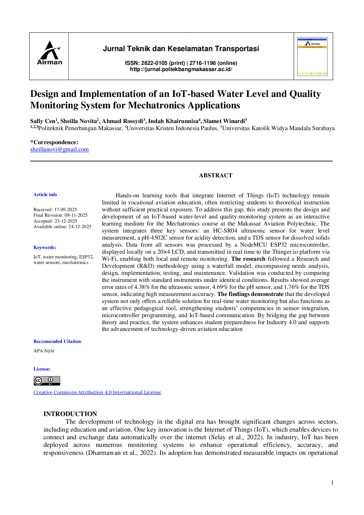 Airman: Jurnal Teknik dan Keselamatan TransportasiAirman: Jurnal Teknik dan Keselamatan TransportasiPenelitian ini menyajikan desain dan pengembangan sistem monitoring level dan kualitas air berbasis IoT sebagai media pembelajaran interaktif untuk mata kuliah Mechatronics di Politeknik Penerbangan Makassar. Sistem ini mengintegrasikan tiga sensor utama: sensor ultrasonik HC-SR04 untuk pengukuran level air, sensor pH-4502C untuk deteksi keasaman, dan sensor TDS untuk analisis padatan terlarut. Data dari semua sensor diproses oleh mikrokontroler NodeMCU ESP32, ditampilkan secara lokal pada LCD 20×4, dan ditransmisikan secara real time ke platform Thinger.io melalui Wi-Fi, memungkinkan pemantauan lokal dan jarak jauh. Penelitian ini mengikuti metodologi Research and Development (R&D) menggunakan model waterfall, meliputi analisis kebutuhan, desain, implementasi, pengujian, dan pemeliharaan. Validasi dilakukan dengan membandingkan instrumen dengan instrumen standar dalam kondisi yang identik. Hasil menunjukkan tingkat kesalahan rata-rata sebesar 4,38% untuk sensor ultrasonik, 4,69% untuk sensor pH, dan 1,76% untuk sensor TDS, yang mengindikasikan akurasi pengukuran yang tinggi.