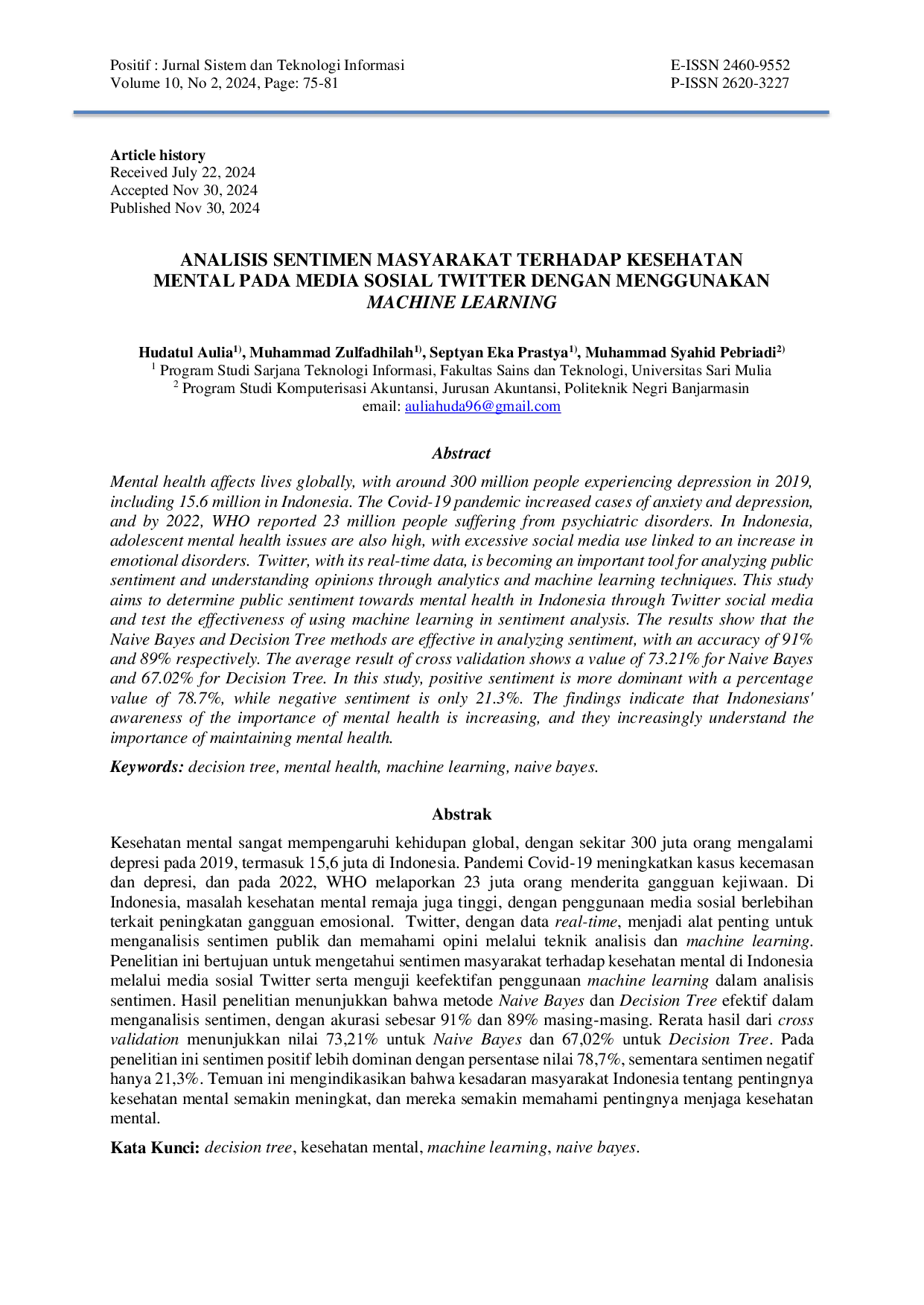 POSITIF : Jurnal Sistem dan Teknologi InformasiPOSITIF : Jurnal Sistem dan Teknologi InformasiKesehatan mental sangat mempengaruhi kehidupan global, dengan sekitar 300 juta orang mengalami depresi pada 2019, termasuk 15,6 juta di Indonesia. Pandemi Covid-19 meningkatkan kasus kecemasan dan depresi, dan pada 2022, WHO melaporkan 23 juta orang menderita gangguan kejiwaan. Di Indonesia, masalah kesehatan mental remaja juga tinggi, dengan penggunaan media sosial berlebihan terkait peningkatan gangguan emosional. Twitter, dengan data real-time, menjadi alat penting untuk menganalisis sentimen publik dan memahami opini melalui teknik analisis dan machine learning. Penelitian ini bertujuan untuk mengetahui sentimen masyarakat terhadap kesehatan mental di Indonesia melalui media sosial Twitter serta menguji keefektifan penggunaan machine learning dalam analisis sentimen. Hasil penelitian menunjukkan bahwa metode Naive Bayes dan Decision Tree efektif dalam menganalisis sentimen, dengan akurasi sebesar 91% dan 89% masing-masing. Rerata hasil dari cross validation menunjukkan nilai 73,21% untuk Naive Bayes dan 67,02% untuk Decision Tree. Pada penelitian ini sentimen positif lebih dominan dengan persentase nilai 78,7%, sementara sentimen negatif hanya 21,3%. Temuan ini mengindikasikan bahwa kesadaran masyarakat Indonesia tentang pentingnya kesehatan mental semakin meningkat, dan mereka semakin memahami pentingnya menjaga kesehatan mental.