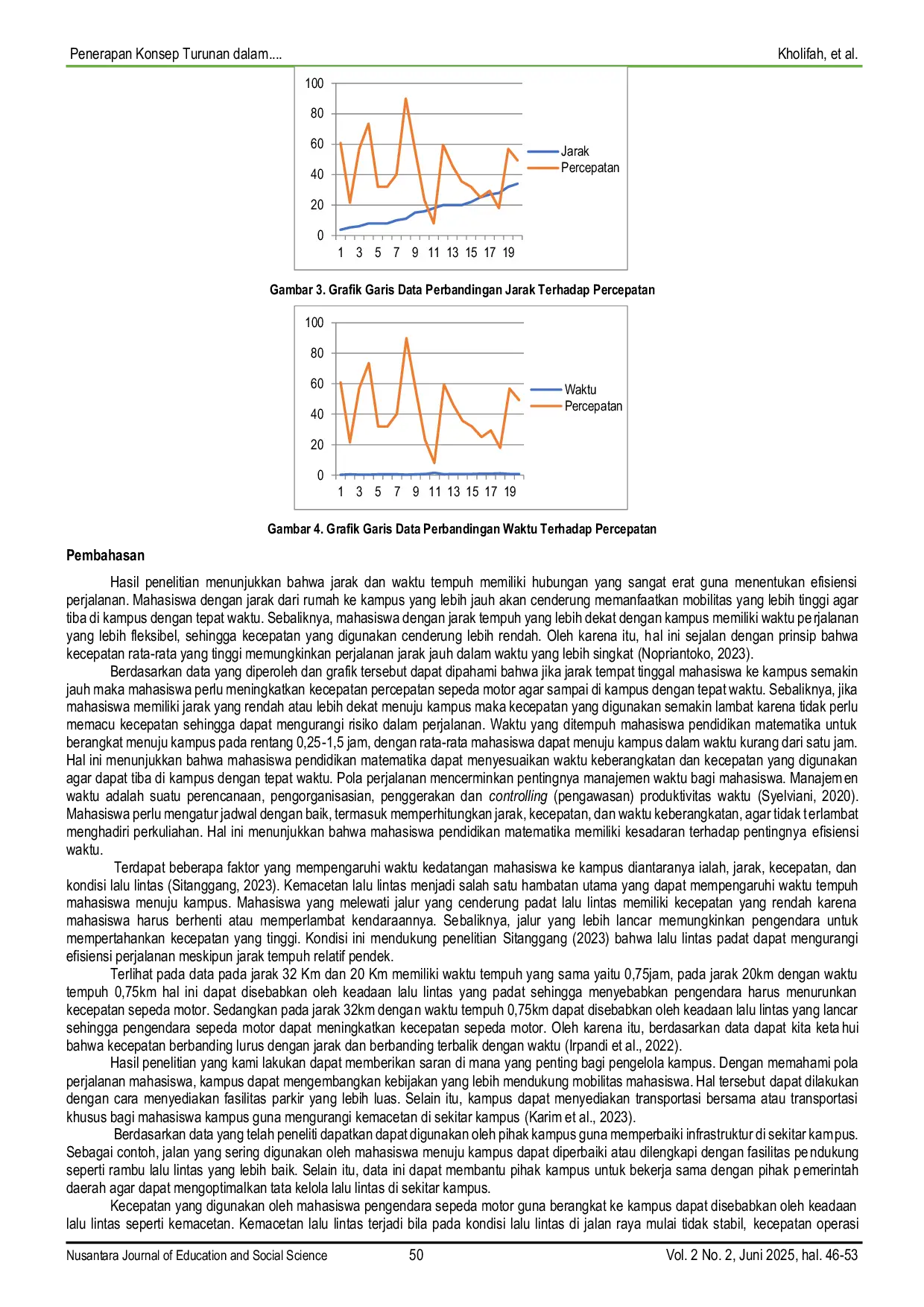 Nusantara Journal of Education and Social ScienceNusantara Journal of Education and Social SciencePenelitian ini bertujuan untuk menerapkan konsep turunan dalam menentukan efektivitas mahasiswa Universitas Indraprasta PGRI dalam perjalanan menuju kampus dengan menggunakan sepeda motor. Data diperoleh melalui angket dan hasil observasi yang berisi jarak dari rumah ke kampus dan waktu tempuh untuk setiap mahasiswa. Dengan menerapkan konsep turunan pertama pada fungsi posisi, diperoleh kecepatan sesaat yang menggambarkan laju perubahan jarak terhadap waktu. Turunan kedua kemudian digunakan untuk menghitung percepatan, memberikan informasi tentang perubahan kecepatan selama perjalanan. Hasil penelitian menunjukkan bahwa mobilitas berkorelasi positif, di mana mahasiswa yang tinggal lebih jauh cenderung memiliki mobilitas yang lebih tinggi. Temuan ini diharapkan dapat membantu mahasiswa merencanakan perjalanan lebih efektif.