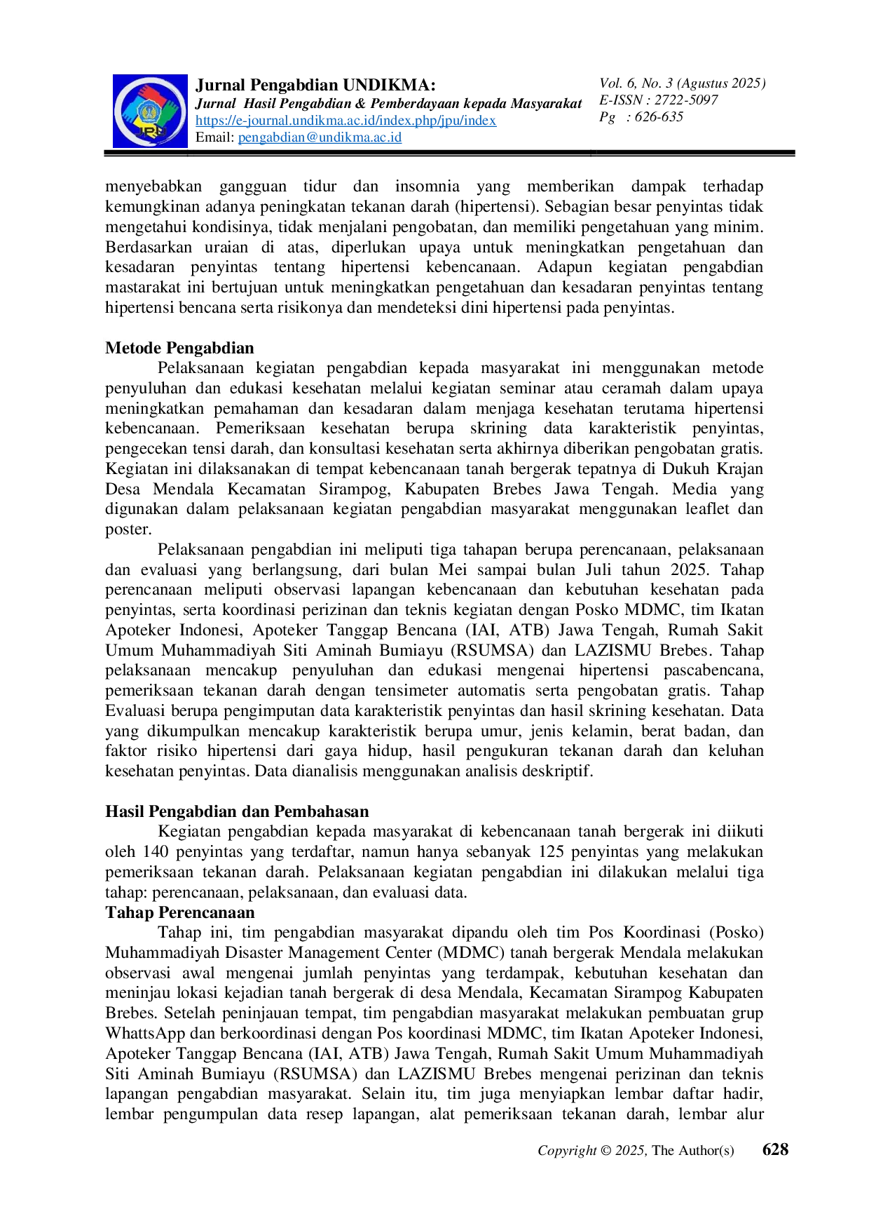 Jurnal Pengabdian UNDIKMAJurnal Pengabdian UNDIKMAKegiatan pengabdian kepada masyarakat ini bertujuan untuk meningkatkan pengetahuan dan kesadaran penyintas tentang hipertensi bencana serta risikonya dan mendeteksi dini hipertensi pada penyintas di Desa Mendala Kabupaten Brebes. Metode kegiatan ini dengan penyuluhan kesehatan terkait hipertensi kebencanaan, pemeriksaan kesehatan dan pengobatan gratis dengan jumlah 140 penyintas. Kegiatan ini dilakukan melalui tiga tahap: perencanaan, pelaksanaan, dan evaluasi. Hasil pemeriksaan tensi darah sebanyak 50 orang yang mengalami hipertensi 1, 2 dan sistolik, dengan faktor risiko usia kebanyakan paruh baya, lanjut usia dan lanjut usia tua sebanyak 75,6%, serta 35,2% merupakan perokok aktif dari kalangan laki-laki. Evaluasi menunjukkan tingkat partisipasi dan antusiasme yang tinggi dalam mengikuti kegiatan ini, dimana penyintas mendapatkan edukasi terkait hipertensi kebencanaan, skrining, konsultasi kesehatan dan pemberian obat gratis.