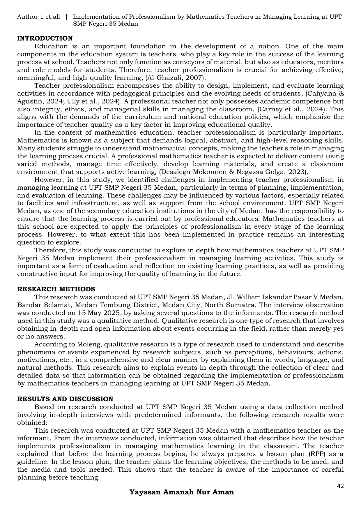 Berdasarkan hasil studi, dapat disimpulkan bahwa guru yang menjadi sumber daya manusia adalah guru matematika profesional.Karakteristik utama guru profesional meliputi persiapan menyeluruh, termasuk pengembangan rencana pelajaran, penguasaan materi, penggunaan metode dan media pembelajaran yang tepat, serta kemampuan menciptakan lingkungan belajar yang nyaman dan menyenangkan bagi siswa.Guru juga harus menyadari pentingnya pengembangan diri, baik melalui pelatihan maupun pengalaman mengajar sehari-hari.Meski menghadapi tantangan seperti keterbatasan fasilitas sekolah, guru berupaya memastikan proses belajar tetap efektif.Selain itu, keberhasilan mengajar tidak hanya diukur dari nilai siswa, tetapi juga dari pemahaman materi dan kenyamanan siswa saat belajar.Guru menekankan bahwa sikap profesional harus ditunjukkan melalui tindakan konkret, seperti disiplin, tanggung jawab, dan terus berusaha meningkatkan diri.